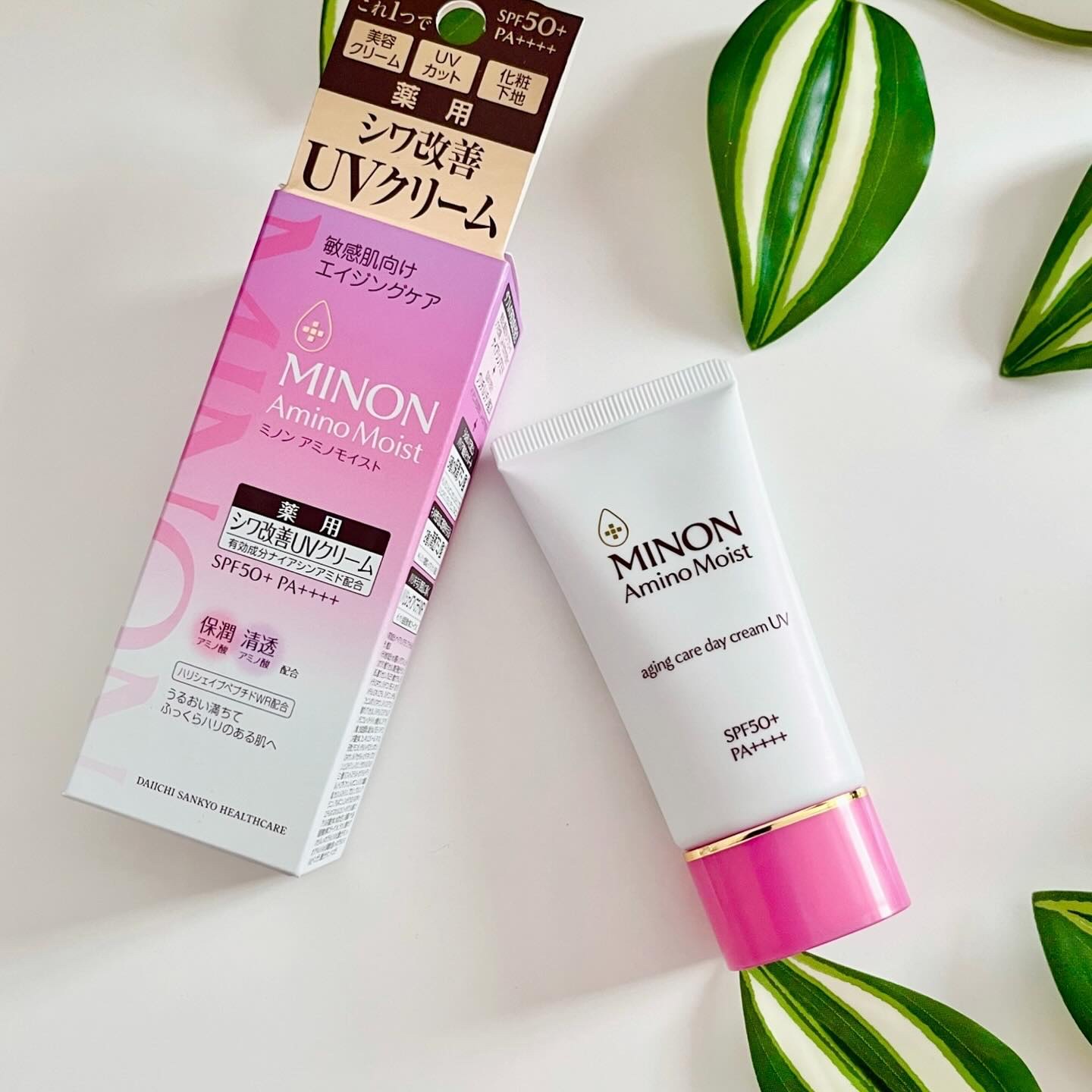 - 【シワ改善もできるUVクリーム】 SPF50+PA++++ シワ改善×UVカットが出来る薬用シワ改善UVクリーム。これ1本で美容クリーム・UVカット・化粧下地の3役。 シワ改善&しみ*予防成分「ナイアシンアミド」、肌あれ予防成分「グリチルリチン酸2K」配合。紫外線吸収剤&酸化亜鉛フリーで敏感肌を考えた処方。自然な輝きを放つ、やわらかなテクスチャーの化粧下地、見る角度で反射色が変わる「艶肌ダブルカラーパウダー」配合で自然な立体感を演出。 エイジングケア:年齢に応じたお手入れケア *メラニンの生成を抑え、しみ・そばかすを防ぐ (販売名:ミノンアミノモイストAU)【医薬部外品】