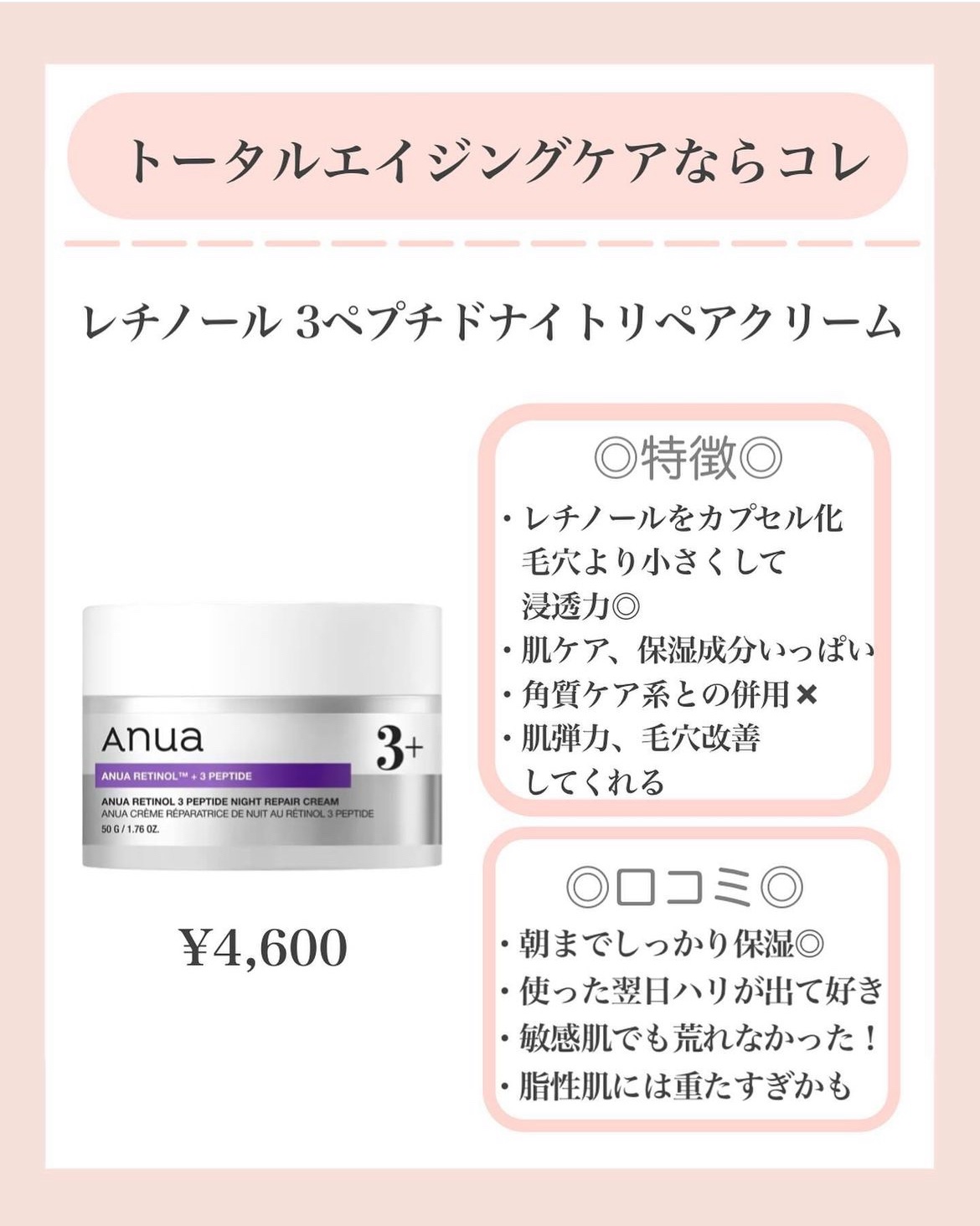 【使った商品】ANUAレチノール3ペプチドナイトリペアクリーム【商品の特徴】レチノール✖️ペプチドまたセラミド、ナイアシンアミドなどその他成分も充実!!【使用感】こっくりとした濃厚なクリームクリーム自体は硬めで伸びはあまり良くない脂性肌の人に...