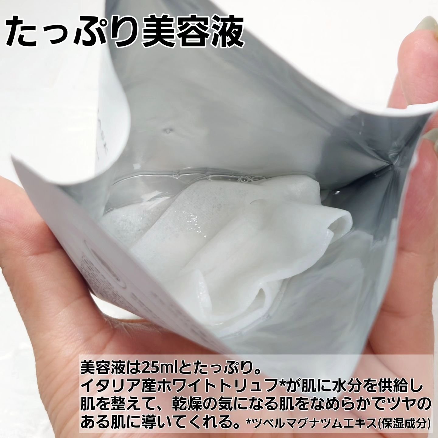 - イタリア産ホワイトトリュフ*が肌に水分を供給し肌を整えて、ざらついて乾燥の気になる肌をなめらかでツヤのある肌に導きます。 *ツベルマグナツムエキス(保湿成分) イタリアヴィーガン認証V-LABEL取得 皮膚低刺激テスト済み* *全ての方に皮膚刺激が発生しないということではありません。 【使い方】 1.洗顔後、化粧水で肌を整えます。 2.袋からシートを取り出し、顔のラインに合わせてマスクを貼ります。 3.約10~20分後シートを取り外し、残ったエッセンスを手のひらで優しく肌に馴染ませます。 【使用上の注意】 お肌に異常が生じていないかよく注意して使用してください。化粧品がお肌に合わないとき即ち次のような場合には、使用を中止してください。そのまま使用を続けますと、症状を悪化させることがありますので、皮ふ科専門医等にご相談されることをおすすめします。(1)使用中、赤味、はれ、かゆみ、刺激、色抜け(白斑等)や黒ずみ等の異常があらわれた場合(2)使用したお肌に、直射日光があたって(1)のような異常があらわれた場合