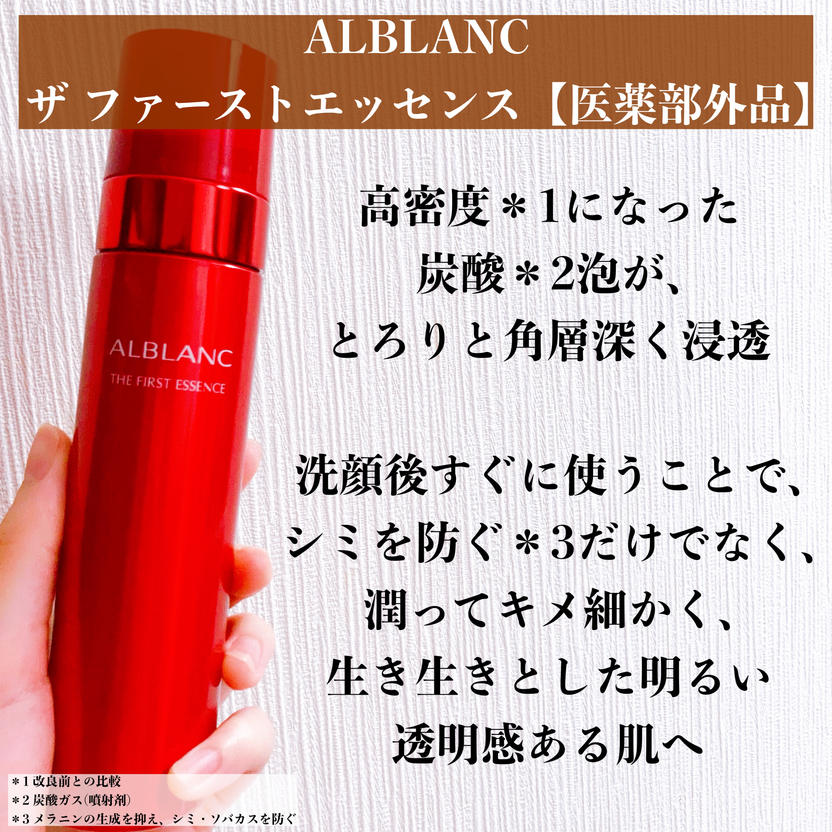 - 【医薬部外品】 潤いを巡らせる高密度*2な炭酸泡*1の美容液 より高密度*2な炭酸*1泡が角層の奥深く浸透し、うるおいが駆け巡り、光溢れる透明感を生み出す。この新たな美しさをあなたへ。 ・潤ってキメを整え明るい透明感へ:日本で唯一*3ALBLANCに配合センレンシエキス(保湿) *3 日本で唯一薬用化粧品にALBLANCが配合(22年12月時点) ・シミ・ソバカスを防ぐ*4:有効成分カモミラET配合 ・ブランケア成分Ⅱ(保湿)配合 *1 炭酸ガス(噴射剤) *2 改良前薬用ファーストエッセンスとの比較 *4 メラニンの生成を抑え、シミ・ソバカスを防ぐ