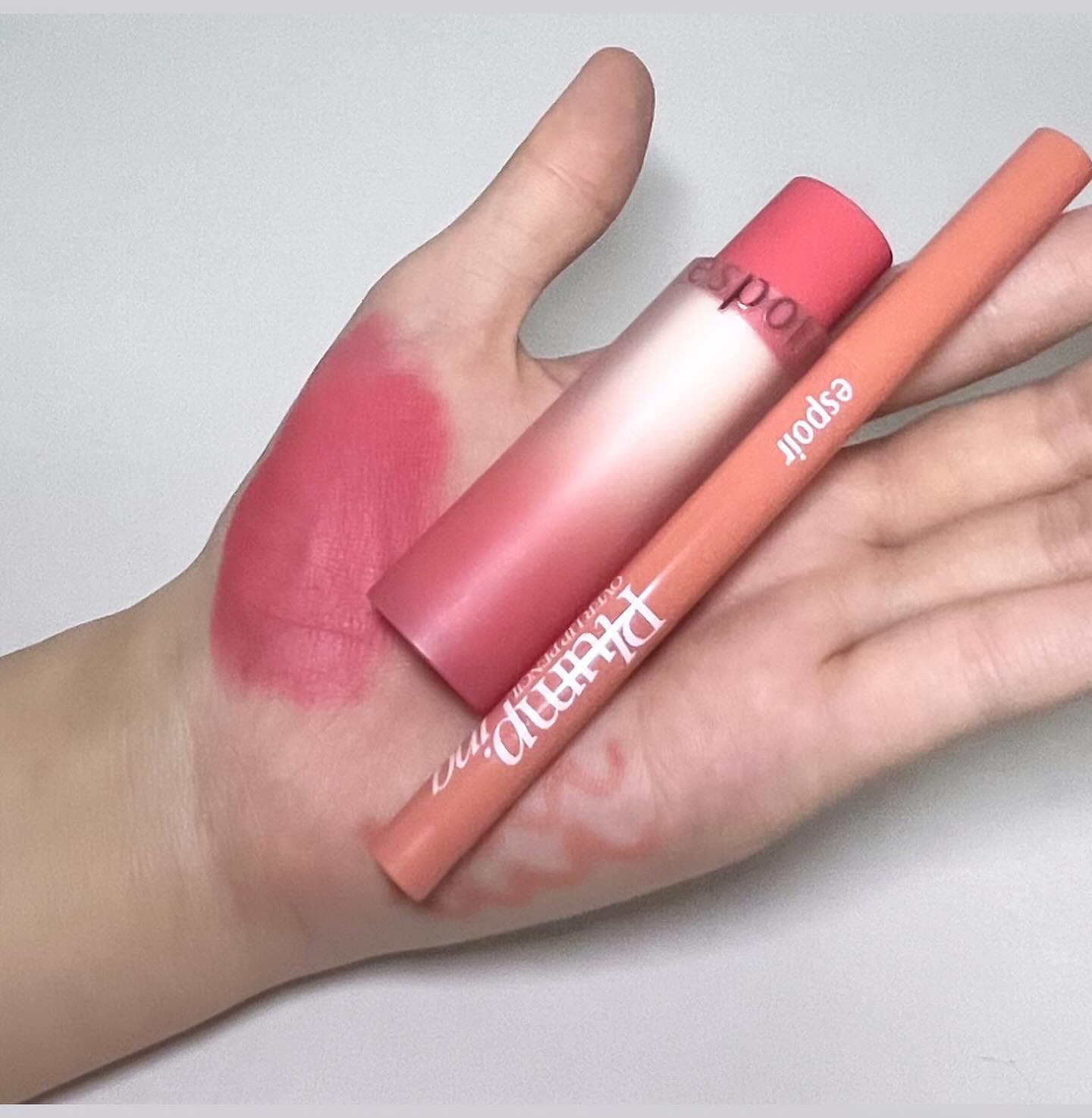 マットリップの方は絶妙にローズ感があるコーラルカラーで、内側に塗って縁をぼかすだけで韓国学生みたいな儚さのある綺麗な唇になります🎀 リップペンシルにしては珍しいプランプ効果があるみたいです✋🏻 塗って少しするとじんわり暖かくなって少しピリピリします!! 2つともびっくりするほどスルスル塗れるところが個人的最高です💙