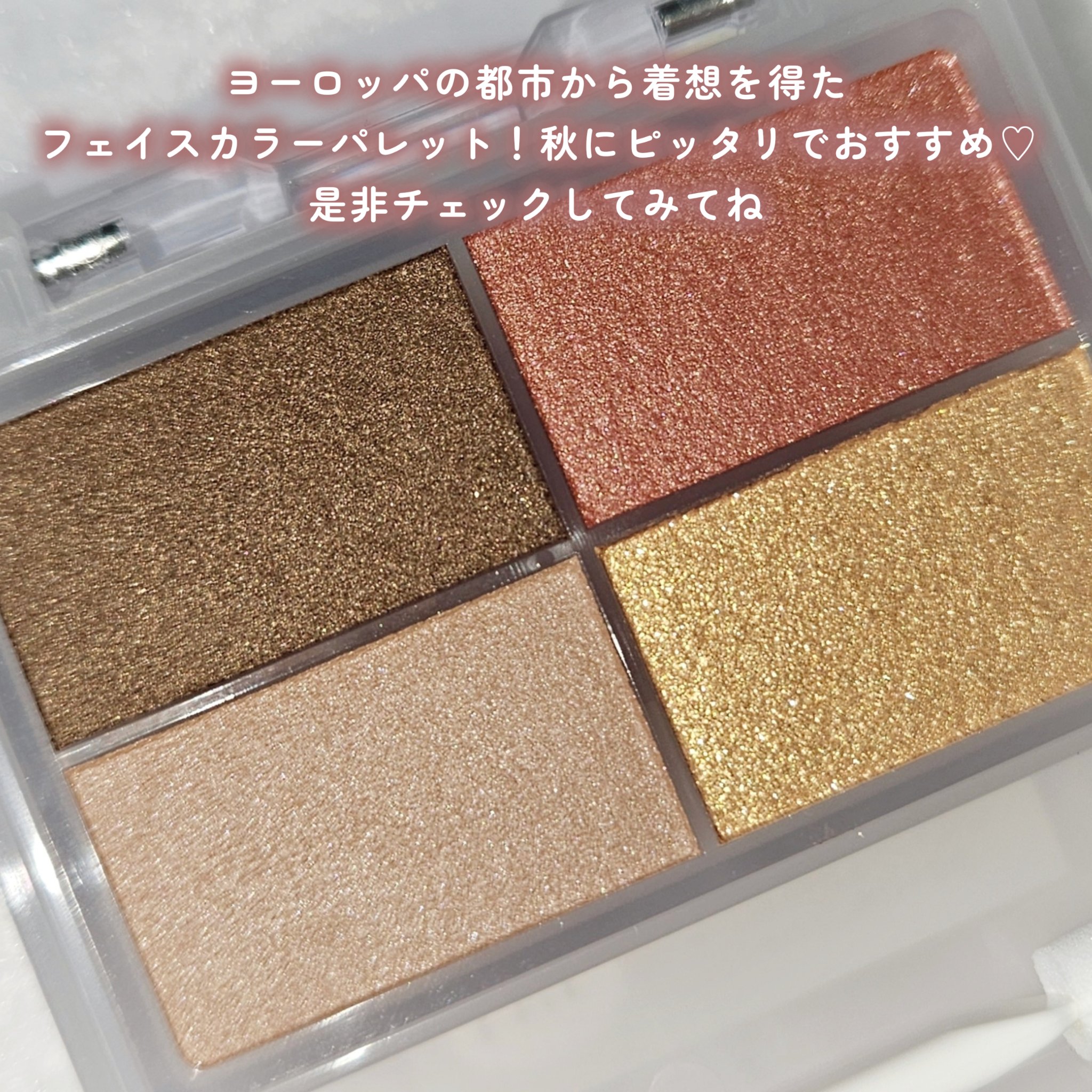 - シェードカラー・ミディアムカラー・ニュアンスカラー・スパークルカラーの4色が1つにまとまったメイクパレットです。 アイシャドウだけでなく、アイブロウやシェーディングとしても使えるカラーが入っているので、眉から目元まで、パレット1つでアイメイクが完成します。 カラーの組み合わせ次第でアレンジが広がり、様々なシーンに合わせたアイメイクを自在に楽しめます。 高密度ウレタン素材のチップ付きです。