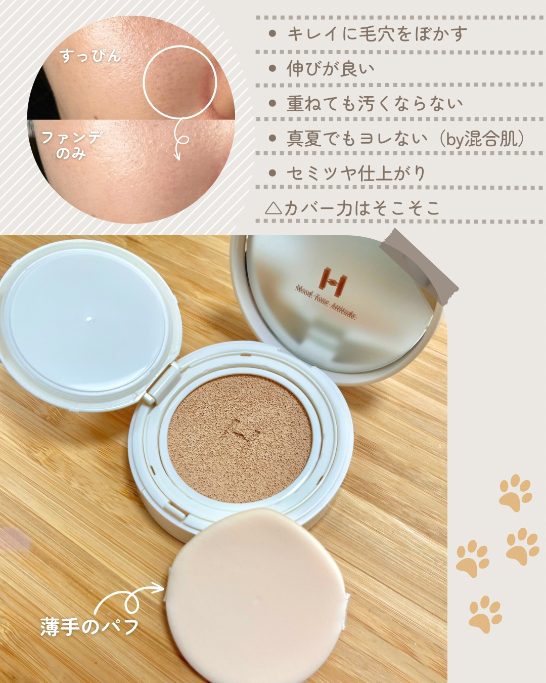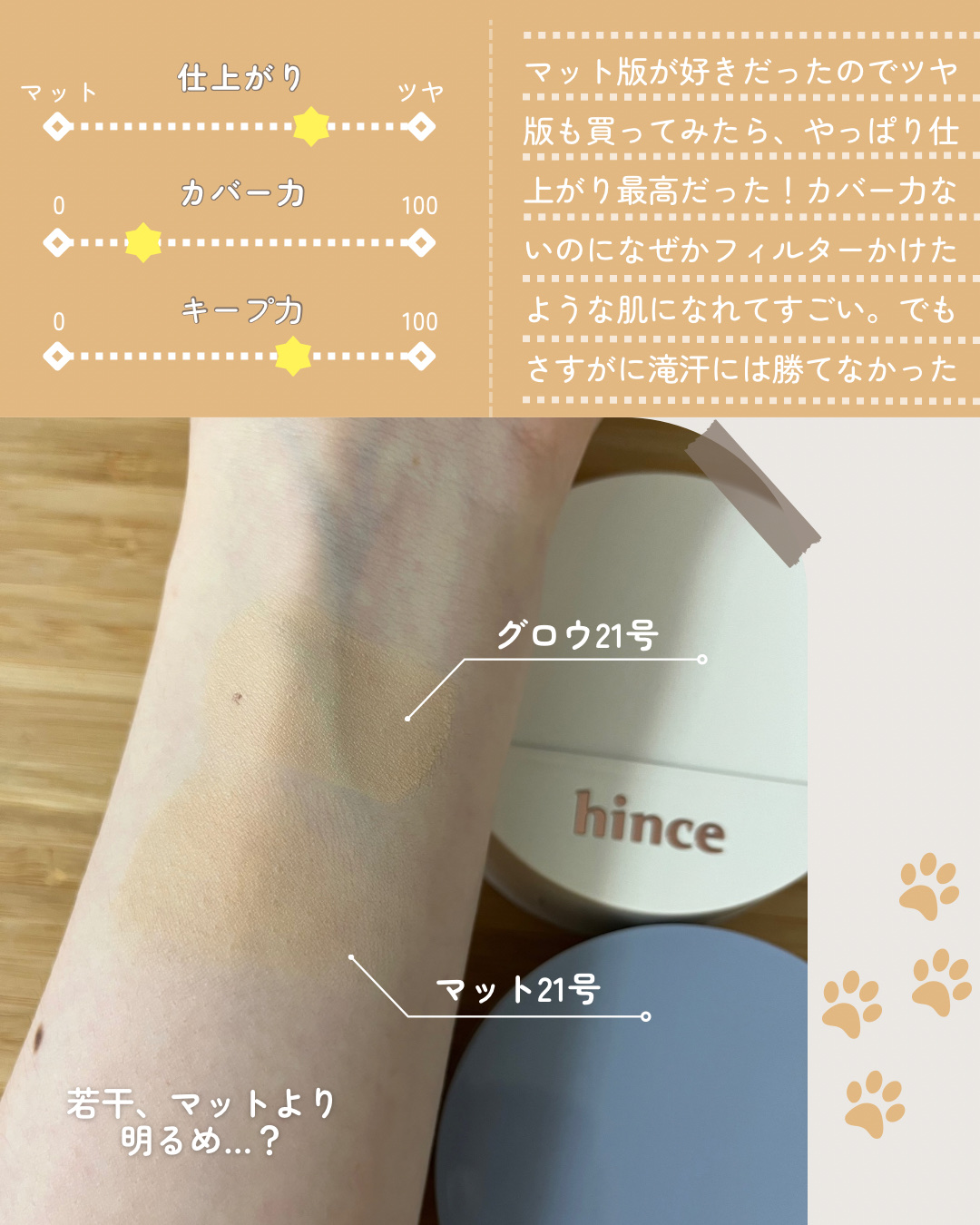hinceセカンドスキンメッシュマットクッション 23マットに仕上がり軽いファンデ買ってみました❗マットなんだけどサラっと軽くて付け心地が良かったです‼素肌を綺麗に見せてくれて、薄いシミは隠れちゃうからなかなか優秀な印象です✨高カバーではない...