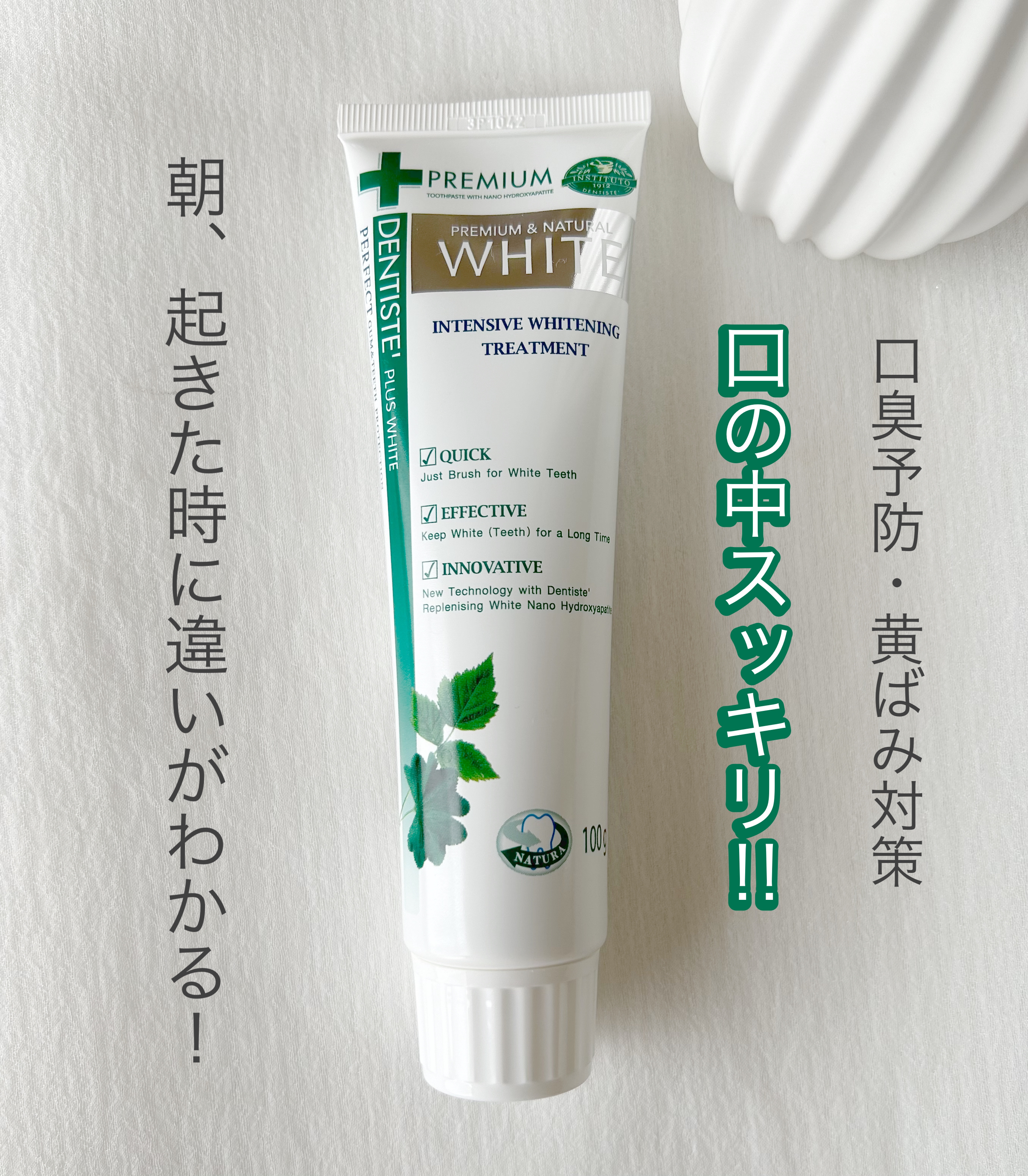 - 歯の細かい汚れやヤニ、黄ばみを落として歯を白くする(※)ホワイトニングハミガキです。 また、口内のネバツキを除去し、口臭もケア。 さっぱりとした使用感で、ホワイトニング(※)と口臭をダブルでケアできます。 ※使用時のブラッシングによる
