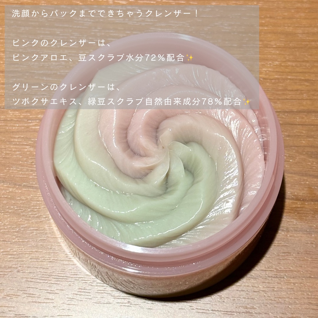 APRILSKINピンクアロエメレンゲクレンザー洗顔、パックにも使える新感覚2wayクレンザー🫧ピンクアロエや豆スクラブ、グリーンの部分はツボクサエキスや緑豆スクラブなどが配合されてるみたい🌿✨肌表面のザラつきを滑らかにしてくれて、汚れもスッ...
