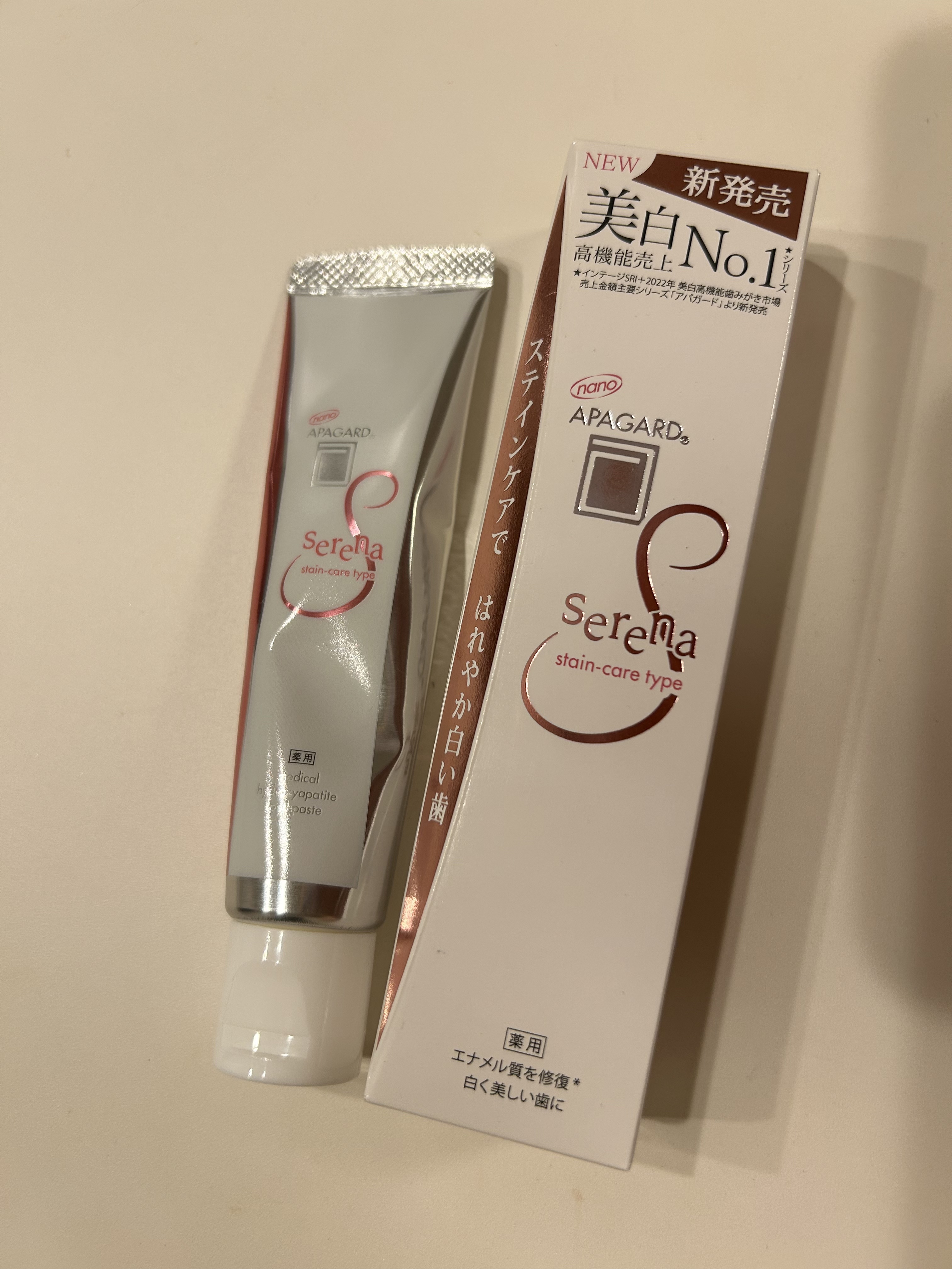 - 【医薬部外品】 美白歯みがき「アパガード」シリーズのステインケアタイプ。サンギ開発のむし歯予防成分「薬用ハイドロキシアパタイト」を配合。歯とほぼ同じ成分(歯のエナメル質の97%はハイドロキシアパタイト)で、エナメル質にアプローチ! さらにステインケア成分をダブル配合*し、コーヒーや紅茶・ワインなどの気になる着色汚れを落とします。 ステインケアではれやか白い歯に。 *メタリン酸ナトリウム(洗浄剤)・クエン酸ナトリウム(洗浄助剤) ●医薬部外品/薬用歯みがき 販売名:サンギMSR