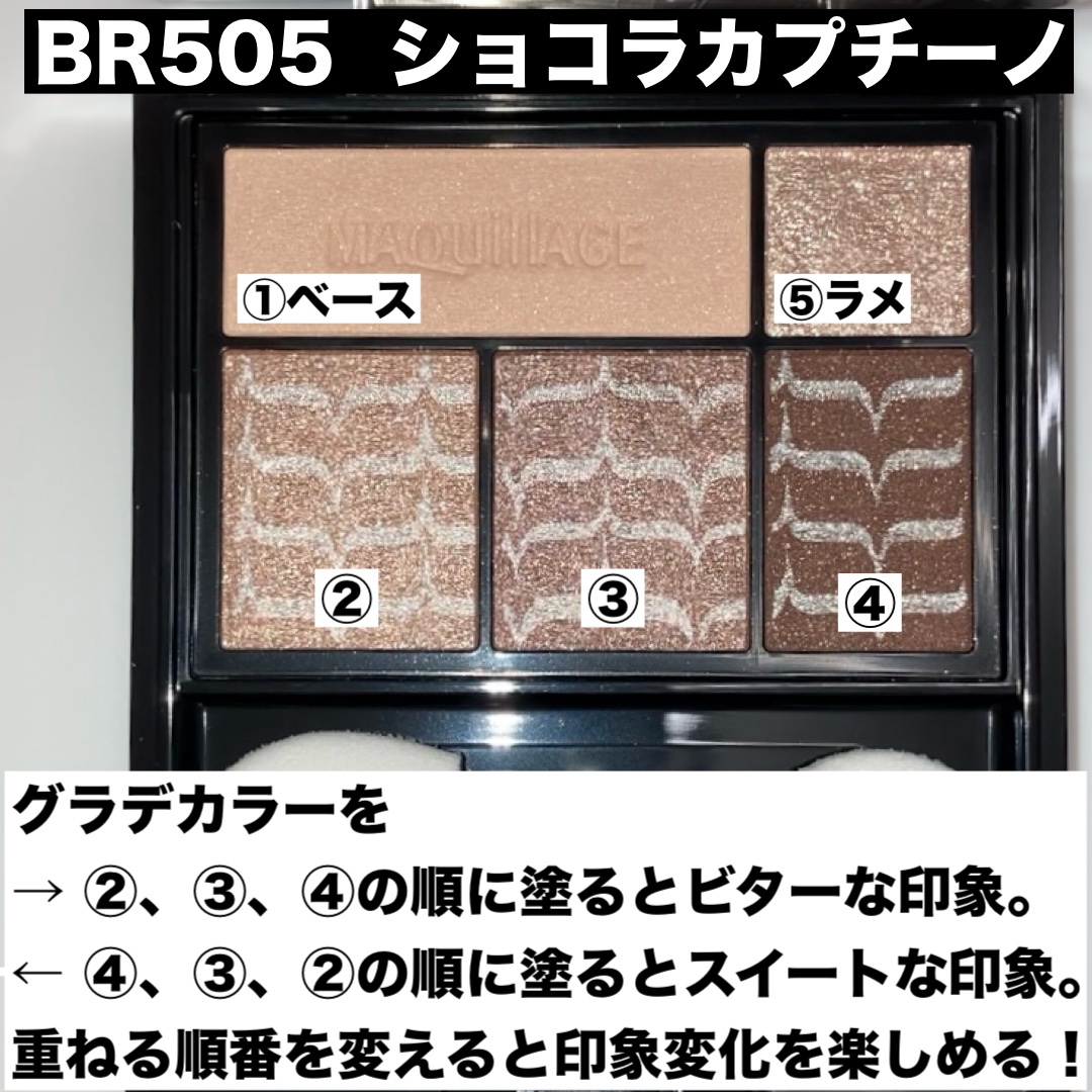 大人っぽくほろ苦いビターブラウン。3色のブラウンで陰影が際立つ目もとに 粉はしっとりとしていて肌馴染みが良いです。重ねる順番でスイートにもビターな目元にもなれます。 保湿成分「スーパーヒアルロン酸」が配合されているので、くすみのない発色が持続します。