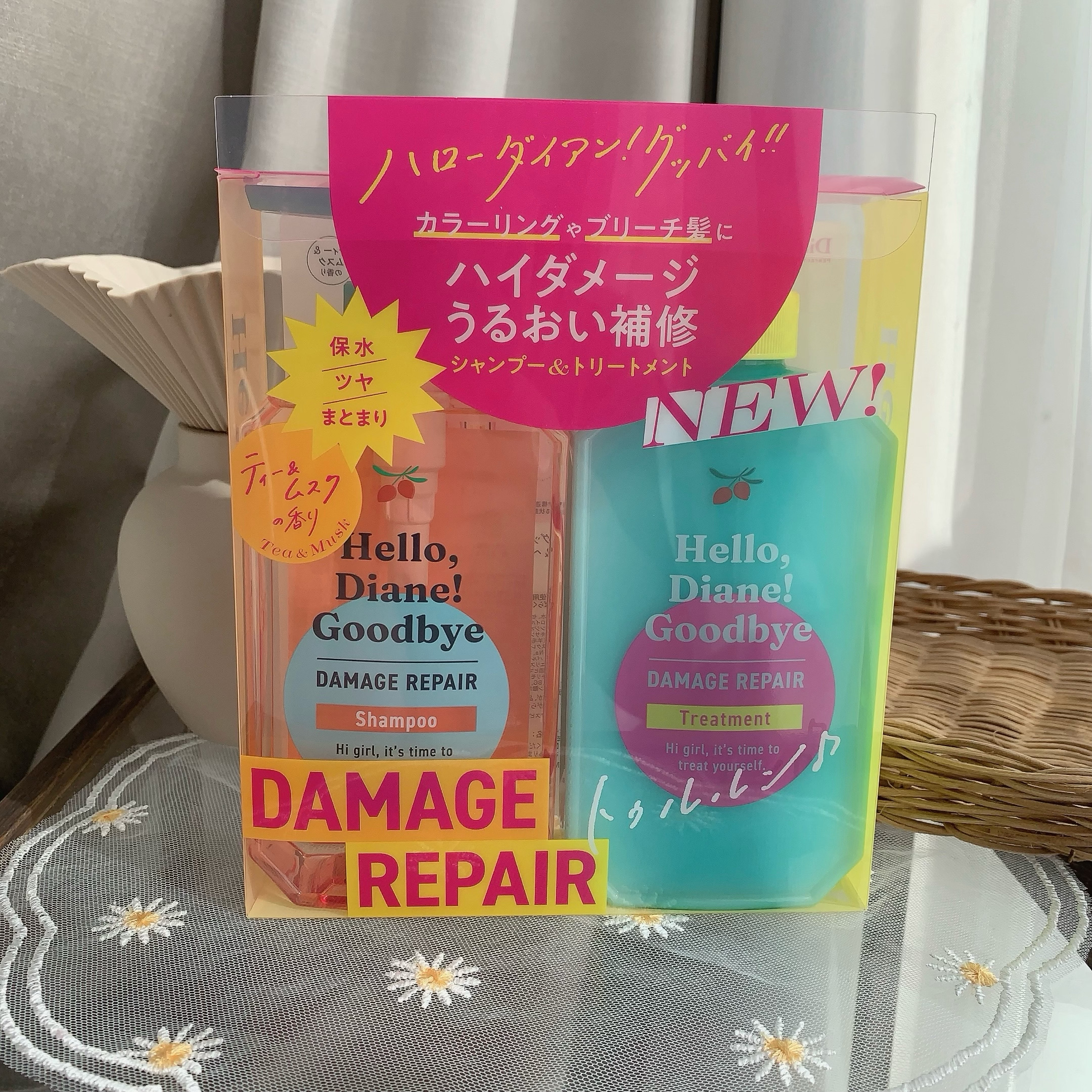 ハイダメージのためのうるおい補修に着目した「Hello, Diane! Goodbye(ハローダイアングッバイ)シリーズ🌷 ポップなカラーが目を惹くボトルがめちゃくちゃ可愛いです😆💗 またティー&ムスクの香りは思っていたよりも強すぎずさっぱりした匂いで甘い香りが苦手な方でも使いやすそう🫧