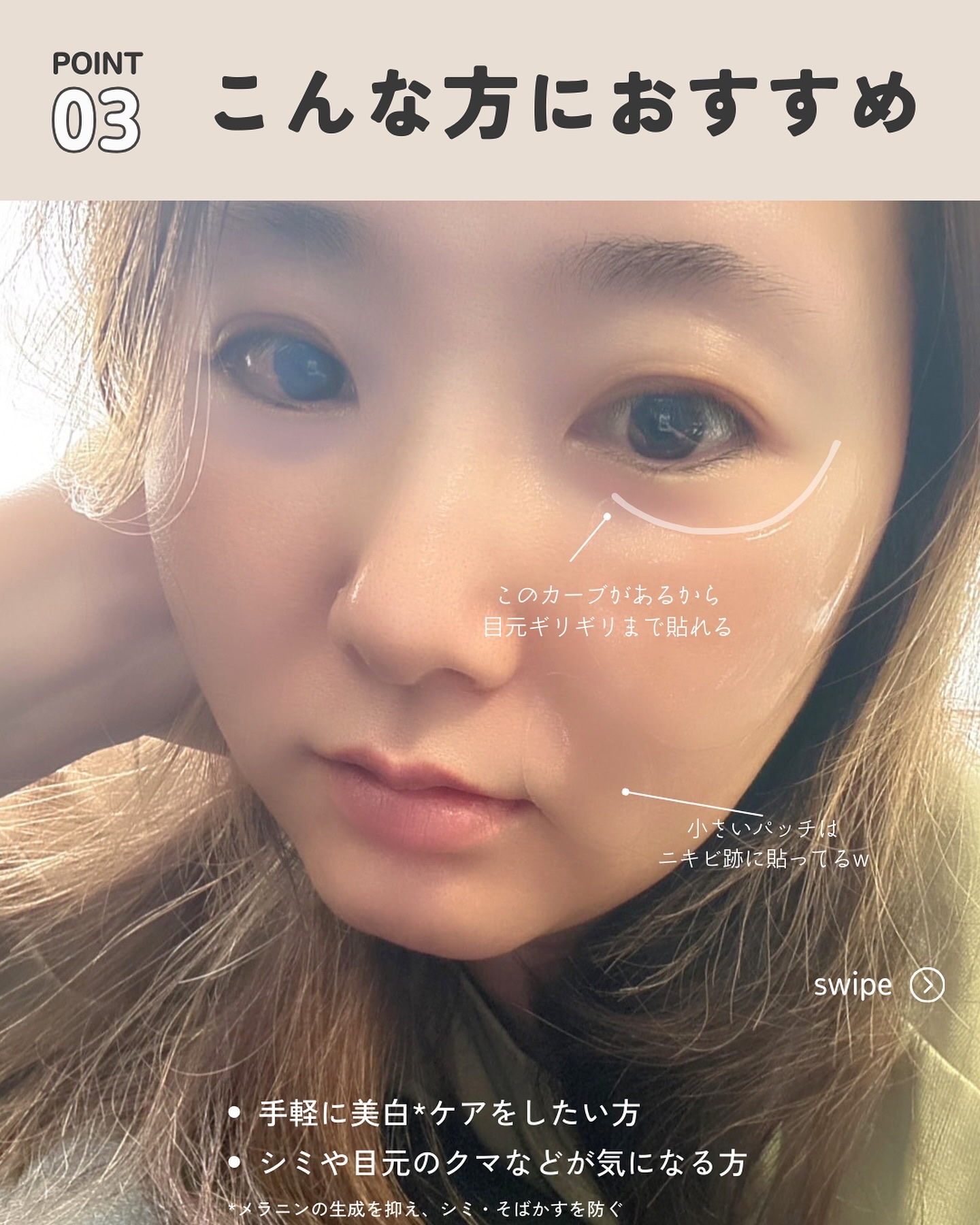 - ●話題の注目成分、グルタチオンとナイアシンアミド配合 2つの成分で乾燥を防ぎ、肌のコンディションを整えます。 ●目元に密着する大きめパッチと、口周りもケアできる小さめパッチの2種類の形状 気になる箇所にピタッと密着して光彩肌に導きます。