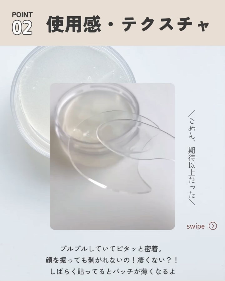 | 目元ケアランキング第37位 | エッセンスがひたひたに染み込んで、 長時間貼っていても乾燥を感じませんでした! | 詳細を見る | ||