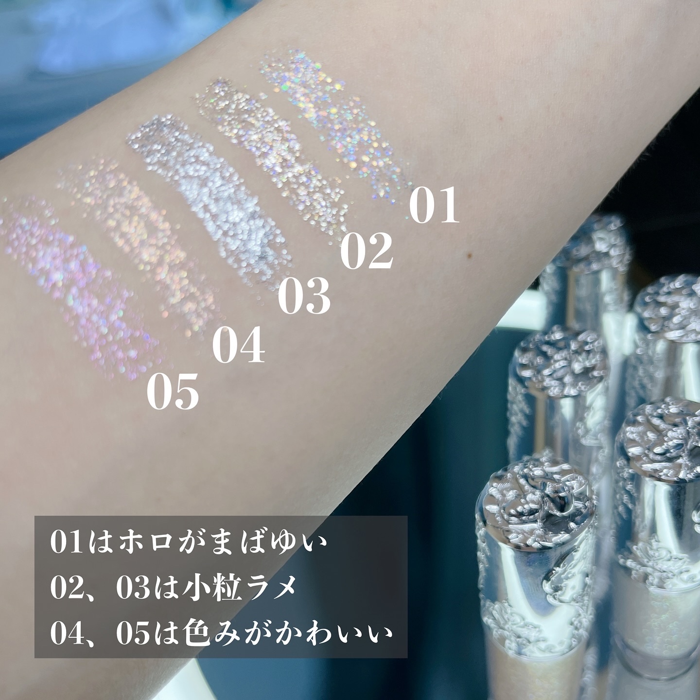 - ガラスのようなグリッターで、煌めく艶感のある目元に。 極細毛先で目元をピンポイントにアレンジ アイライナーだけでなくシャドウとしても使える。速乾性成分配合でピタッと密着して崩れにくいので涙袋におすすめ。