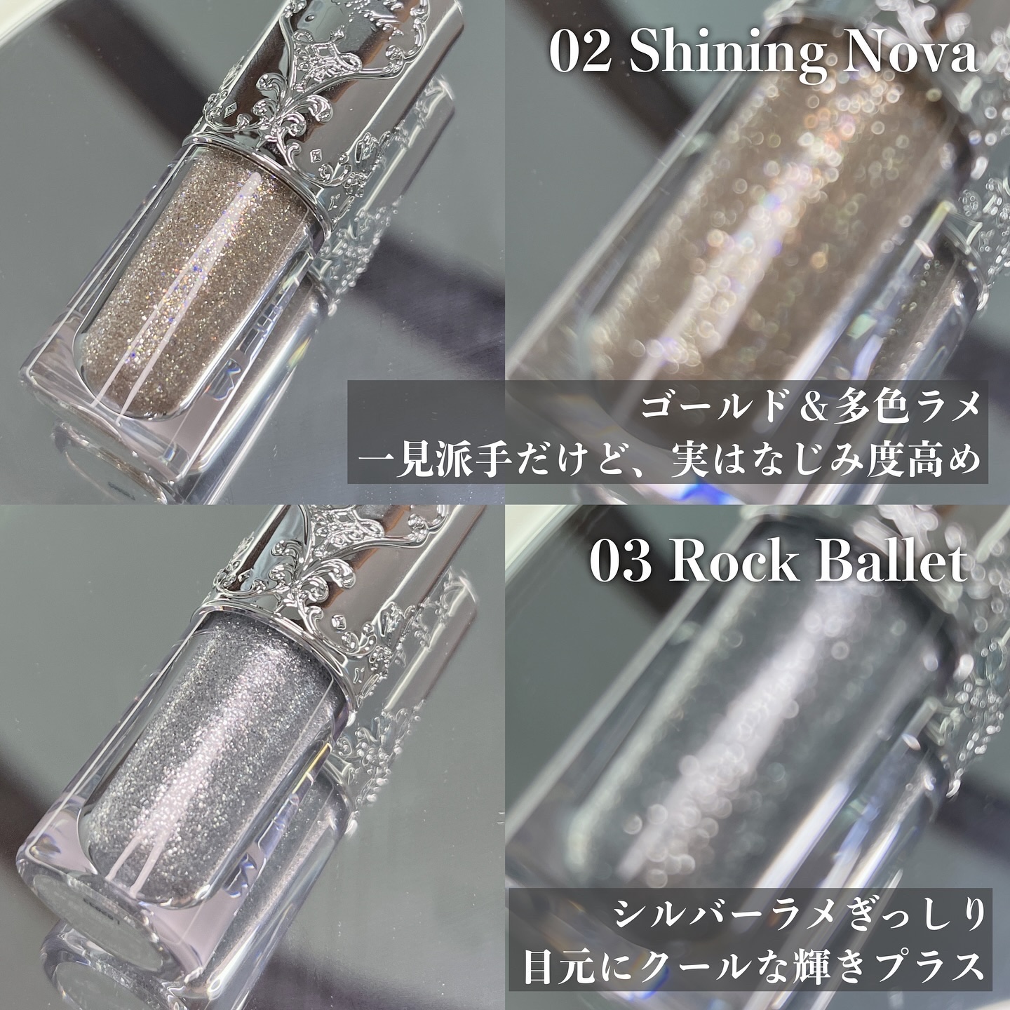 - <03 ロックバレエ> 水、PET、ホウケイ酸(Ca/Na)、アクリレーツコポリマー、PG、PVP、1,2-ヘキサンジオール、ヒドロキシアセトフェノン、ポリアクリロイルジメチルタウリンNa、酸化チタン、シリカ、フィチン酸Na、酸化スズ、Al <01 ダイヤモンドスター> 水、PET、ポリブチレンテレフタレート、アクリレーツコポリマー、(エチレン/VA)コポリマー、PVP、PG、1,2-ヘキサンジオール、ヒドロキシアセトフェノン、ポリアクリロイルジメチルタウリンNa、シリカ、フィチン酸Na <02 シャイニングノヴァ> 水、ポリブチレンテレフタレート、PET、アクリレーツコポリマー、ホウケイ酸(Ca/Al)、(エチレン/VA)コポリマー、銀、PG、PVP、1,2-ヘキサンジオール、ヒドロキシアセトフェノン、シリカ、合成金雲母、ポリアクリロイルジメチルタウリンNa、酸化鉄、酸化チタン、フィチン酸Na、酸化スズ、Al <04 パーフェクトブロッサム> 水、ポリブチレンテレフタレート、アクリレーツコポリマー、(エチレン/VA)コポリマー、ホウケイ酸(Ca/チタン)、ホウケイ酸(Ca/Na)、酸化チタン、PG、PVP、1,2-ヘキサンジオール、ヒドロキシアセトフェノン、ポリアクリロイルジメチルタウリンNa、シリカ、フィチン酸Na、酸化スズ <05 クラッキングクリスタル> 水、ポリブチレンテレフタレート、ホウケイ酸(Ca/Al)、アクリレーツコポリマー、(エチレン/VA)コポリマー、PG、PVP、PET、1,2-ヘキサンジオール、ヒドロキシアセトフェノン、酸化チタン、ホウケイ酸(Ca/チタン)、合成金雲母、シリカ、ポリアクリロイルジメチルタウリンNa、酸化スズ、酸化鉄、フィチン酸Na