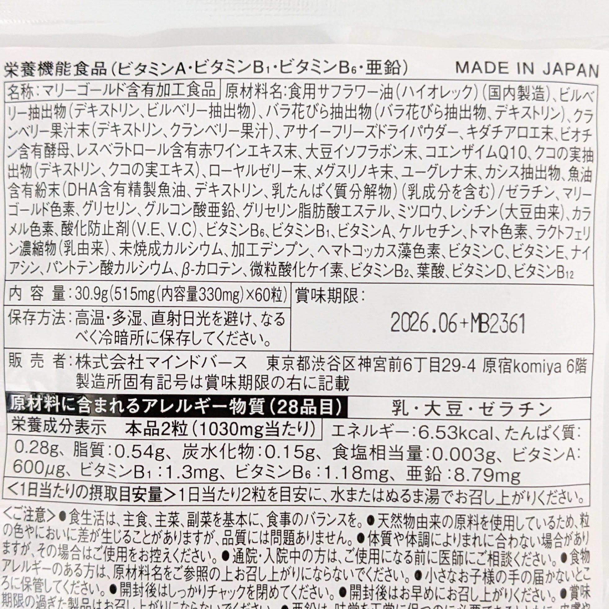ルテイン120㎎/日&ゼアキサンチン6㎎の他にもサポート成分や4種の栄養機能食品など日々の健康も同時に気遣うことができる! つるんとしたソフトカプセルタイプだから飲みにくさは感じなかった。 続けやすい価格帯だから助かるなぁ!