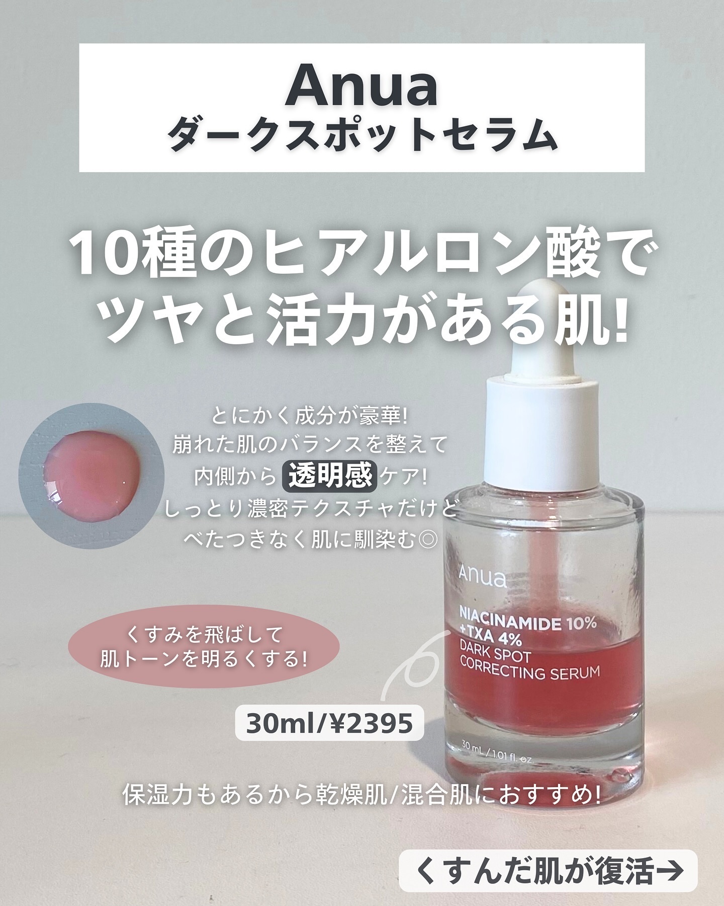 Anuaの美容液の組み合わせを紹介!みんなメガ割でAnuaの美容液買った人多いんじゃない? ニキビに悩む人におすすめしたい組み合わせは、アゼライン酸とシラカバ!この組み合わせ使うようになってニキビ出来にくくなった気がする🥺 ナラが最近ハマってる一推し組み合わせは、PDRNとレチノール✨ 毛穴ケアに最適で、使った後の肌のもっちり感がたまらん!
