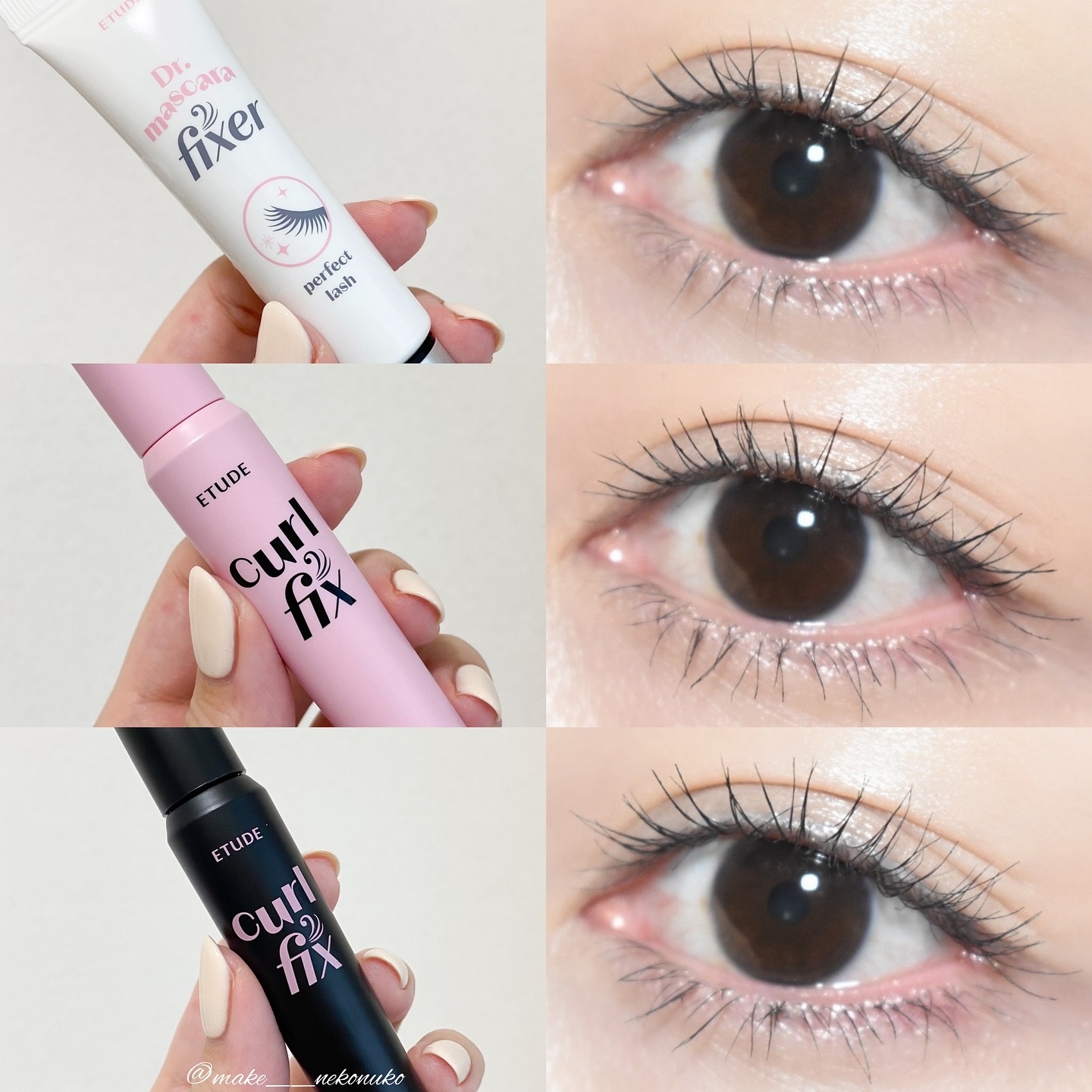 #エチュード の人気マスカラからボリュームタイプ登場🖤 既存のカールフィックスマスカラのブラシより細めで、四角にカッティングされ、目の曲線に沿ってカーブしたスクエアフィットブラシが特徴。 くっきりとしたクリアブラックで印象的なまつ毛を演出 細めのブラシなので、細かいことろにも使いやすくて、下まつ毛にも塗りやすいです。 まつ毛のカールを長時間キープしてくれる#マスカラ下地 カールキープ、ボリュームアップ、トップコートの1本3役👀