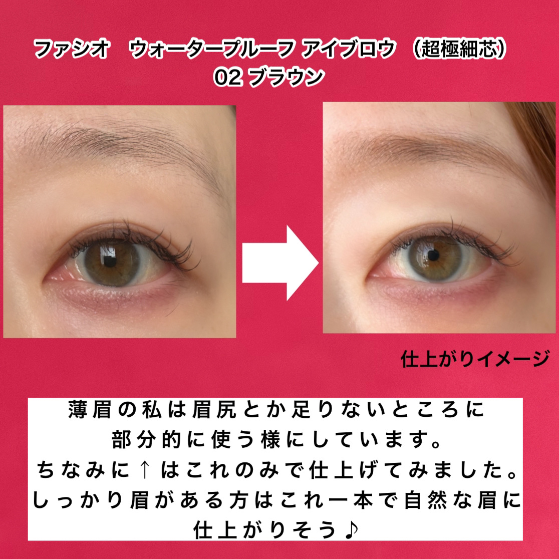 ファシオならでは! ウォータープルーフの超極細芯アイブロウペンシルが新登場!! 思わず、え!ほそ!と言ってしまったくらい細い。0.85mmの超極細芯でまゆ毛の毛を1本1本リアルに生えているように描けるこのペンシル。 あとは、なんといっても落ちにくいから眉が気づいたら消えてる、、、という経験がある方にぜひおすすめしたい。