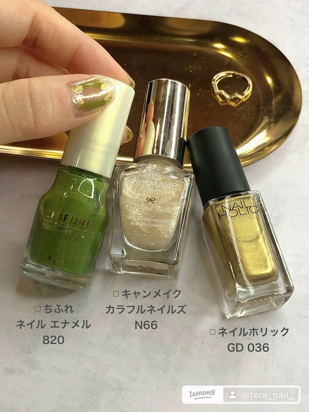 キャンメイクのラメを全体に塗って ちふれの820でうねうね〜 最後はネイルホリックのゴールドでちょんちょんするだけ簡単デザイン🙊💖 使用したポリッシュ ◽︎キャンメイク カラフルネイルズ 🤍✨N66 396円-(税込) ◽︎ちふれ ネイルエナメル 🌿820 440円-(税込) ◽︎ネイルホリック ✨GD 036 330円-(税込) イビツな指先コンプレックスをネイルで克服した私が 簡単かわいいネイルを発信中💅🏻🌈