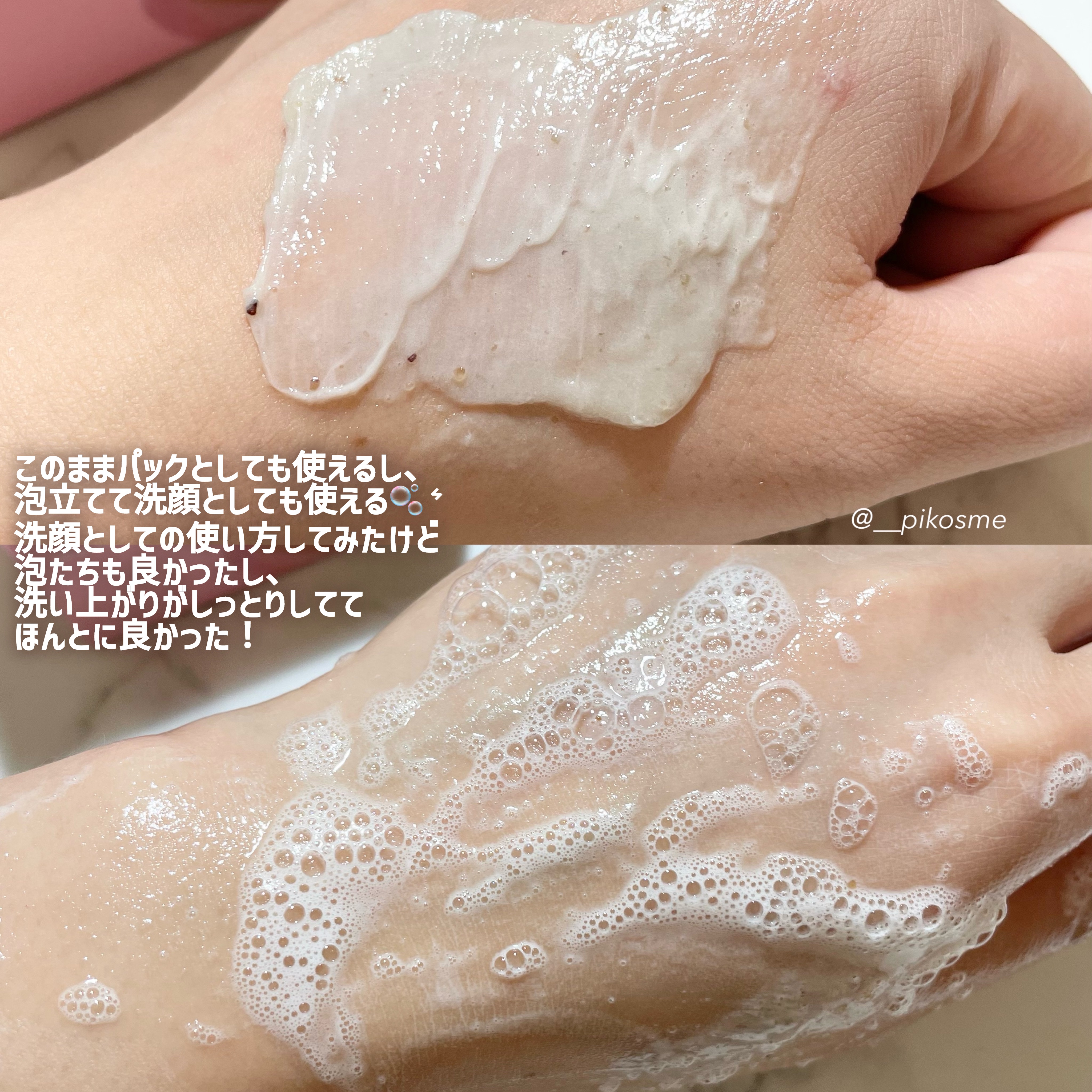 4in1の新感覚メレンゲクレンザー🎀ˊ˗ ピンクと黄緑の2色になっててスクラブが入ってるけど粒が小さいから塗布してるときに痛くないのが嬉しい🌸 洗い上がりはしっとりしてて乾燥感やピリつきを感じないのが◎ スクラブが苦手な人は泡立てネットで先に泡立てるときめ細かい泡になってスクラブのザラザラ感がなくなるからオススメ🕊️