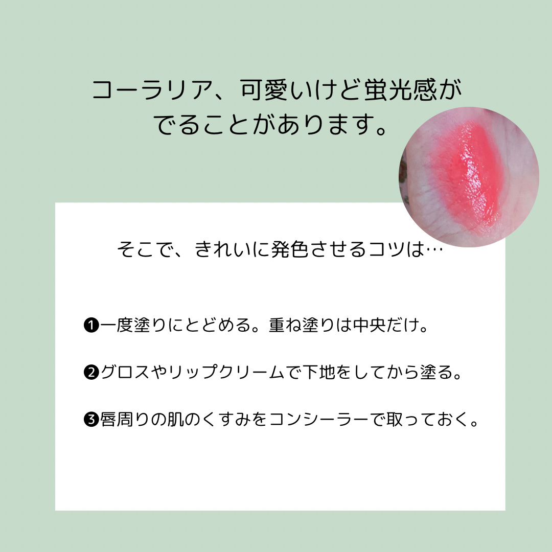とぅるっとぅるなリップと話題になったこのシリーズ。08のコーラリアは打って変わって澄んだクリアなコーラルカラーで、コーラルピンク好きとしては見逃せない本当に可愛い色味です。🪸🪸🪸 質感がピカイチ。グロス代わりに使える。 重ねすぎると若干蛍光味が出て、ムラにもなってくる。