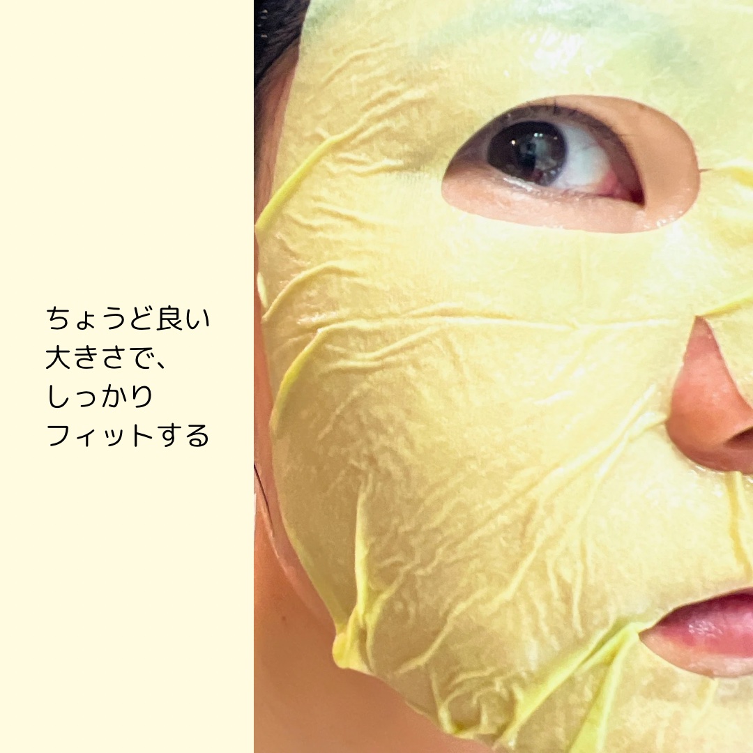 使用時間1分で水分ツヤケアができるシートマスクです。 このシートマスクにはPHA成分が含まれていて、角質除去が期待できます。 シートはわりと薄めです。が、しっかり水分を含んでいることが分かります。 密着度が高いです。シートの大きさや目、鼻、口の位置は私にはぴったりでした。 美容液はちょっととろみがあるものの、重たさがあるわけでもなく、ベタつきもありませんでした。