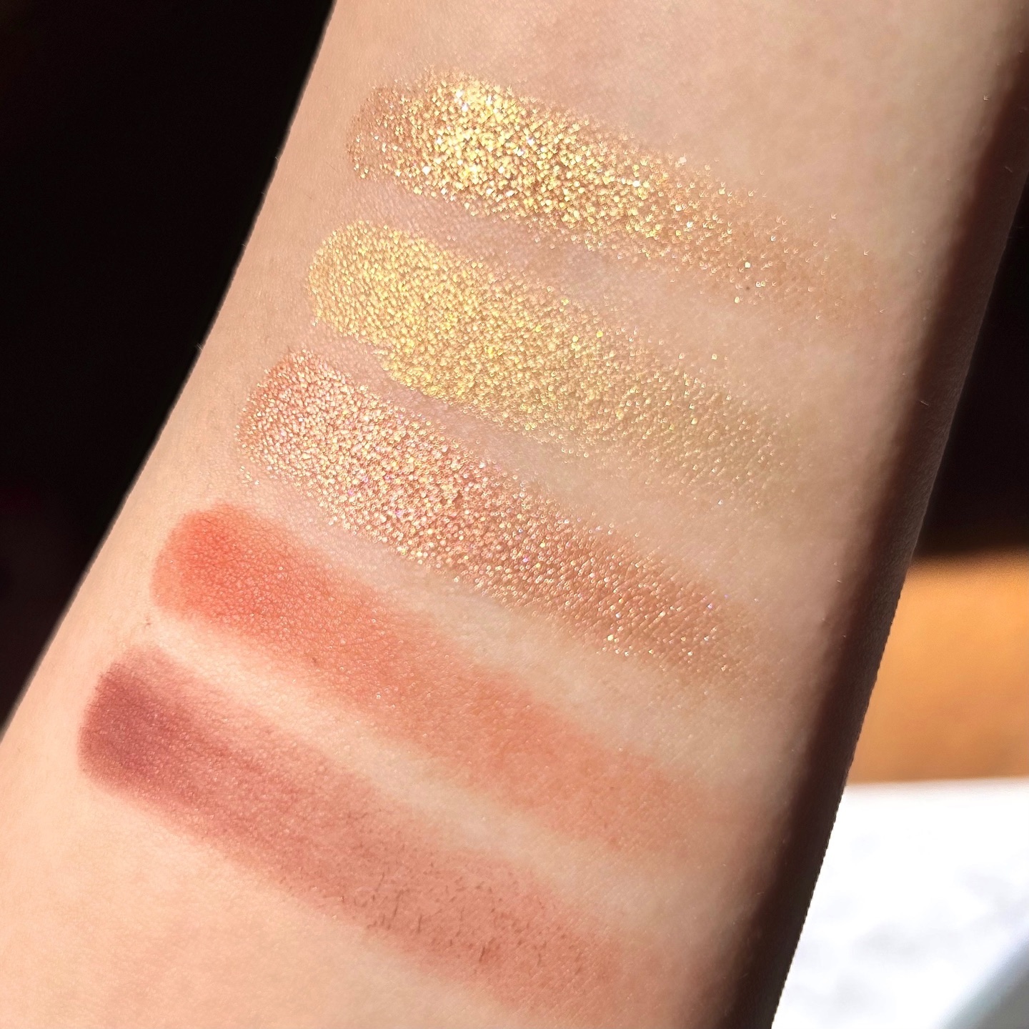 花零…やっぱり偏光が可愛すぎる…! お洒落なパレットという印象🫧 左上のカラーは馴染みよくかなり使いやすい万能カラー 右下のカラーは締め色にちょうどよかったし実は入っているピンクのラメが可愛いの✨ これ使うとほんとお洒落な女になれた気分💃