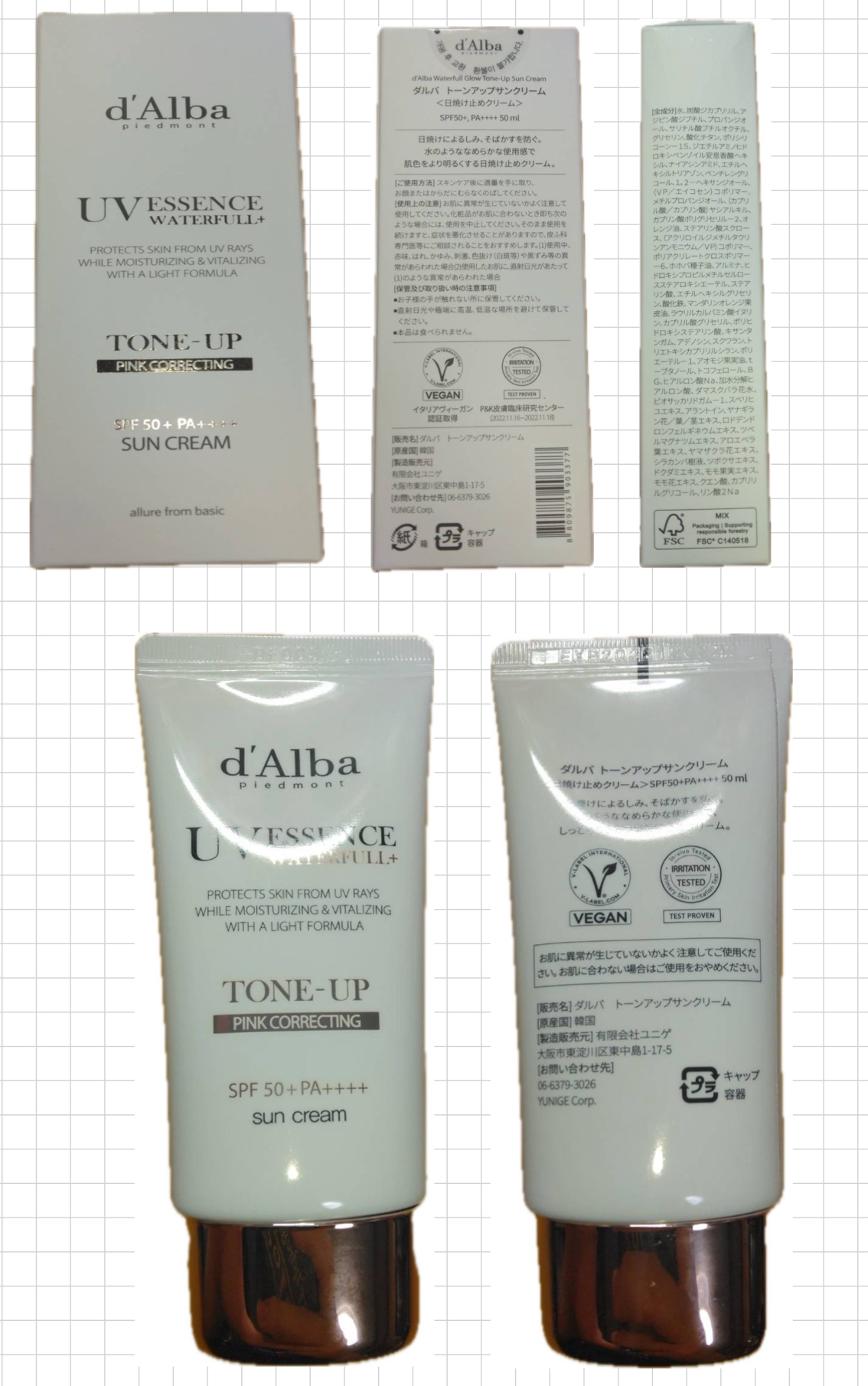 - <ピンク> 水、酸化チタン、ペンチレングリコール、BG、グリセリン、ヒアルロン酸Na、加水分解ヒアルロン酸、キサンタンガム、スクワラン、トコフェロール、アロエベラ葉エキス、ホホバ種子油、アルミナ、ステアリン酸、アジピン酸ジブチル、プロパンジオール、カプリリルグリコール、ポリヒドロキシステアリン酸、ヒドロキシプロピルメチルセルロースステアロキシエーテル、炭酸ジカプリリル、エチルヘキシルグリセリン、ツボクサエキス、ドクダミエキス、スベリヒユエキス、トリエトキシカプリリルシラン、アオモジ果実油、クエン酸、カプリル酸グリセリル、ロドデンドロンフェルギネウムエキス、1,2-ヘキサンジオール、アラントイン、ステアリン酸スクロース、オレンジ油、(アクリロイルジメチルタウリンアンモニウム/VP)コポリマー、ダマスクバラ花水、ナイアシンアミド、ラウリルカルバミン酸イヌリン、マンダリンオレンジ果皮油、(カプリル酸/カプリン酸)ヤシアルキル、リン酸2Na、リモネン、リナロール、シトラール、シラカンバ樹液、メチルプロパンジオール、アデノシン、ジエチルアミノヒドロキシベンゾイル安息香酸ヘキシル、ヤマザクラ花エキス、ビオサッカリドガム-1、t-ブタノール、ポリアクリレートクロスポリマー-6、ポリシリコーン-15、モモ果実エキス、ツベルマグナツムエキス、エチルヘキシルトリアゾン、ヤナギラン花/葉/茎エキス、(VP/エイコセン)コポリマー、カプリン酸ポリグリセリル-2、モモ花エキス、サリチル酸ブチルオクチル、ポリエーテル-1、酸化鉄(CI 77492)、酸化鉄(CI 77491)