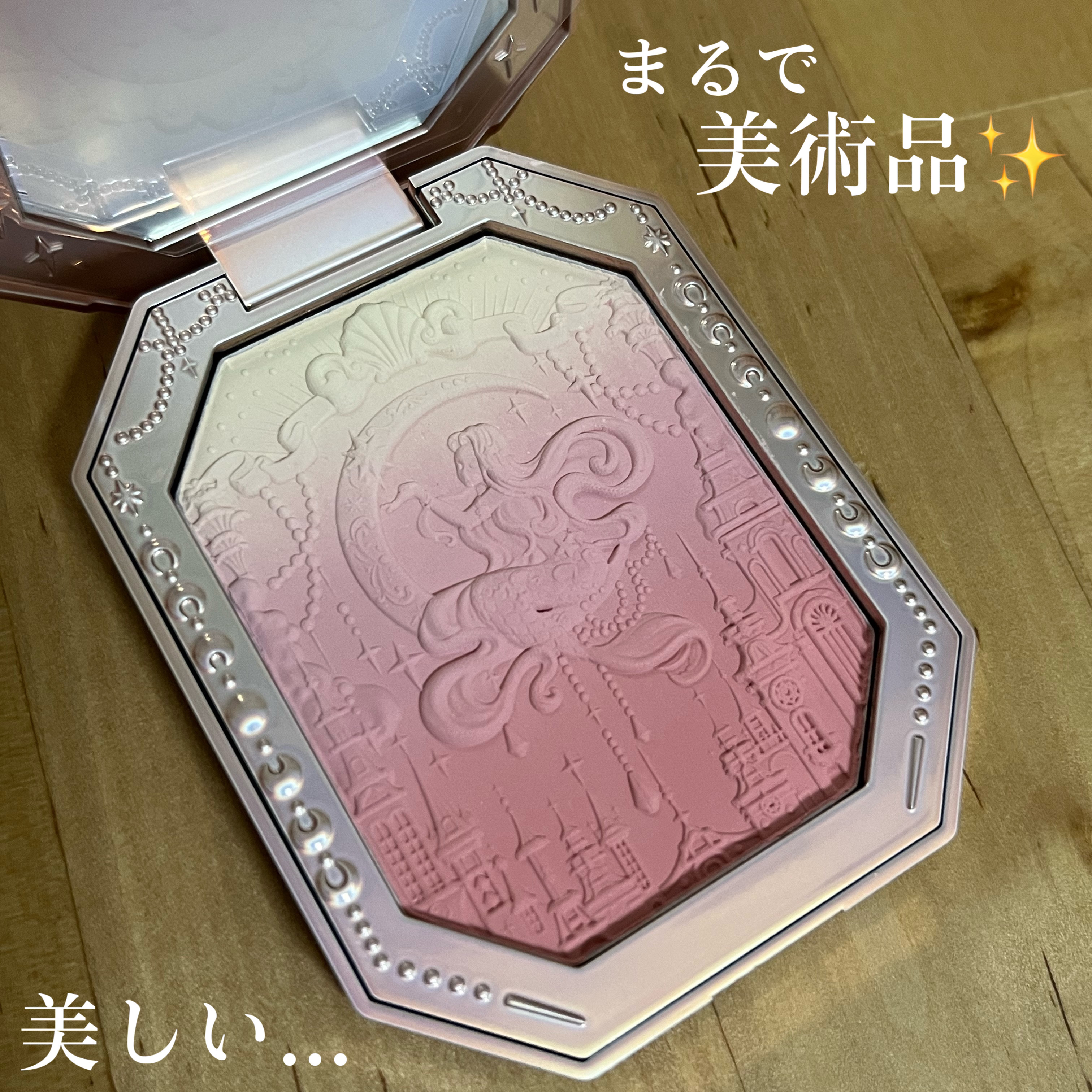- 月光人魚シリーズのチークブラッシュはシリーズ初の3色グラデーションが特徴。どの色番でも混ぜ方次第でイエベ・ブルべ関係なく、絶妙なニュアンスカラーが作れる嬉しいカラー展開。パウダーは柔らかくシルクのような質感を実現し、宝石からインスピレーションを受けた「天空の城を守護する人魚の乙女たちの物語」が描かれたコンパクトが特徴的となっています。