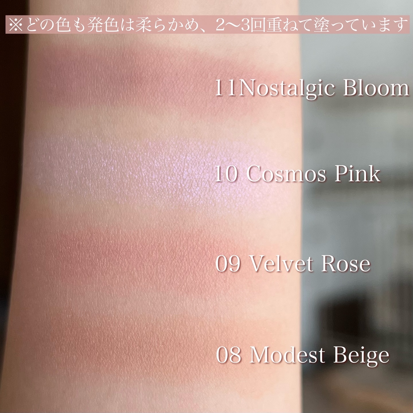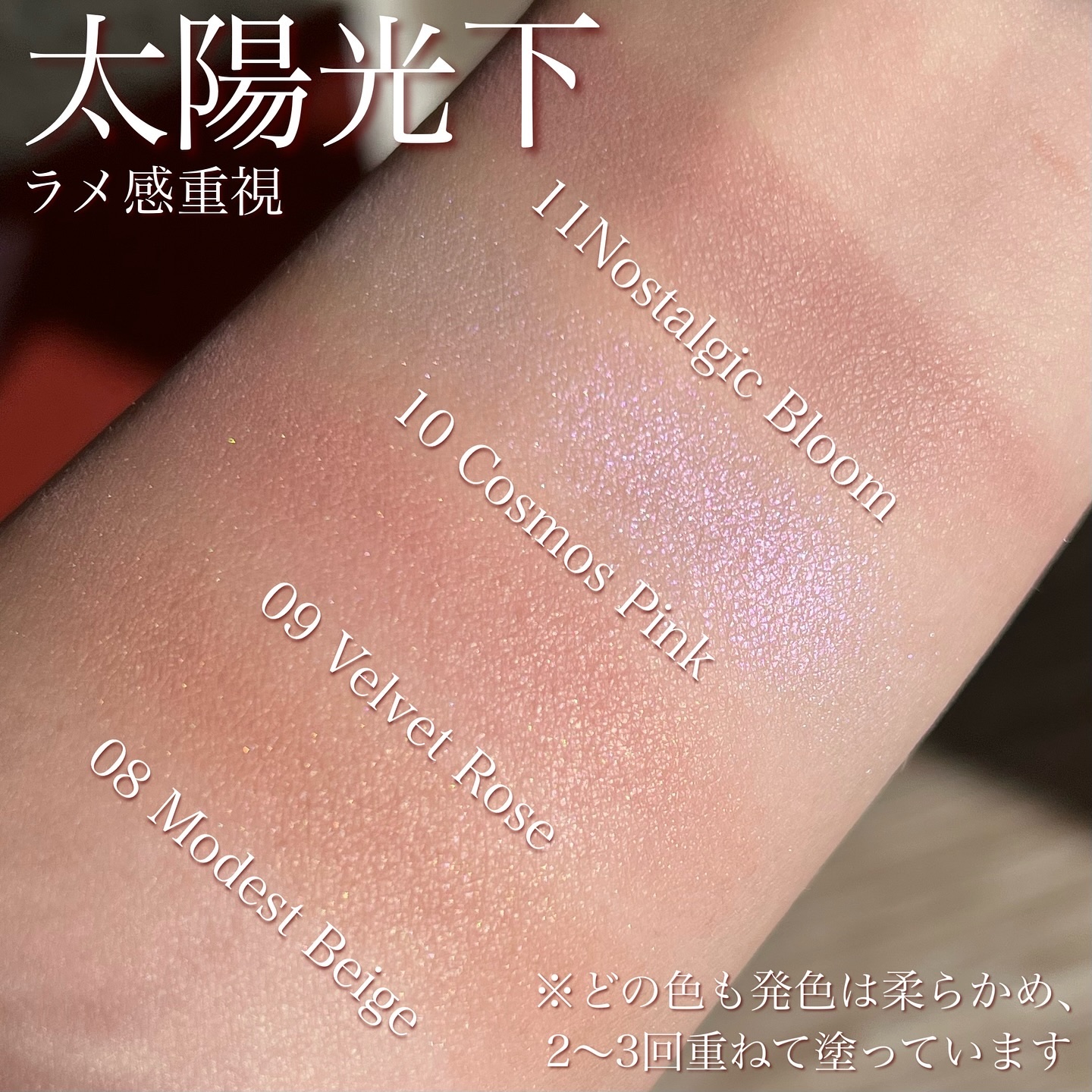 儚げな花びらの色と質感にたとえたペタルフロートアイズ新色💐 秋桜からインスパイアされた4色のカラーは、くすみを含んだアンニュイな色合い。透明感や儚さ、美しさを演出してくれます。 花びらが散る瞬間の儚い美しさを表現した、ソフトマットなアンティークモーブ