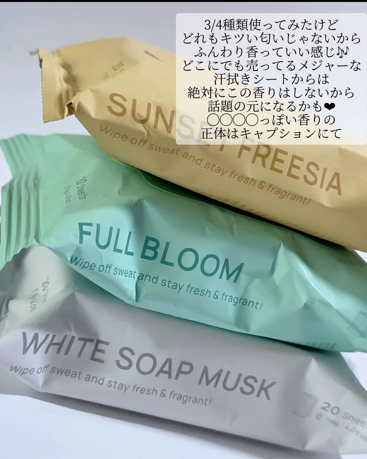 汗でベタついたボディをサラッと&香り付け🌼 厚手で柔らかいシートは1枚で全身拭ける大きめサイズ◎ ホワイトソープアンドムスク 石鹸の香りが強めでほのかに奥の方にムスクが香ります。ムスク系の香りが苦手な私でも爽やかで使いやすかった! これからの夏に大活躍しそうなアイテム☀️ Qoo10で購入できるので是非チェックしてみてください🙌🏻