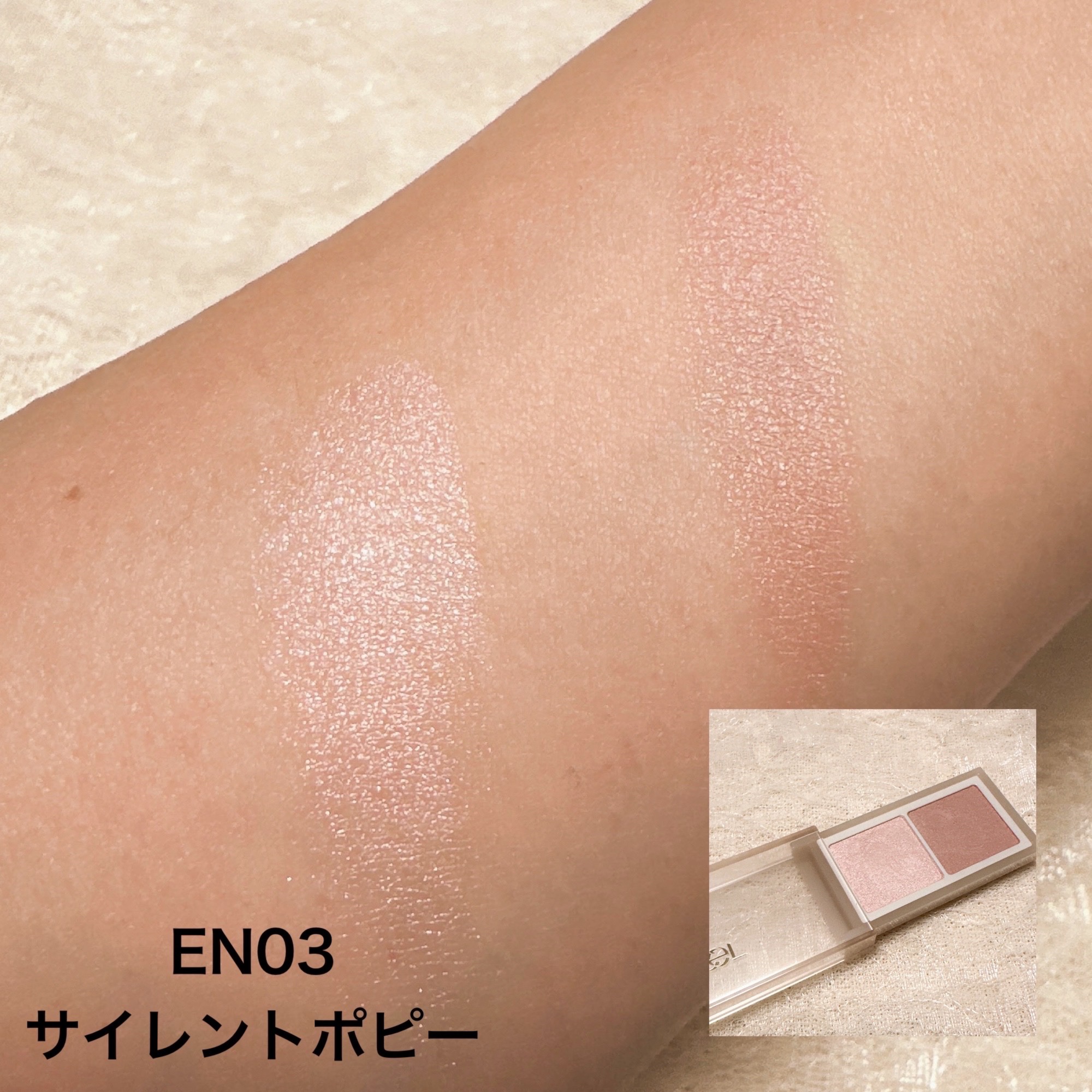 - <EN01 ペールマロウ> タルク、トリエチルヘキサノイン、リンゴ酸ジイソステアリル、イソステアリン酸水添ヒマシ油、合成フルオロフロゴパイト、ポリグリセリル-3ポリジメチルシロキシエチルジメチコン、ラウリン酸亜鉛、スクワラン、トコフェロール、酢酸セルロース、水酸化Al、メチルパラベン、(+/-)グンジョウ、シリカ、マイカ、酸化チタン、酸化鉄、赤226、赤202 <EN02 ファジーコットン> タルク、トリエチルヘキサノイン、リンゴ酸ジイソステアリル、イソステアリン酸水添ヒマシ油、合成フルオロフロゴパイト、ポリグリセリル-3ポリジメチルシロキシエチルジメチコン、ラウリン酸亜鉛、スクワラン、トコフェロール、酢酸セルロース、メチルパラベン、グンジョウ、シリカ、マイカ、酸化チタン、酸化鉄 <EN03 サイレントポピー> タルク、トリエチルヘキサノイン、リンゴ酸ジイソステアリル、イソステアリン酸水添ヒマシ油、合成フルオロフロゴパイト、ポリグリセリル-3ポリジメチルシロキシエチルジメチコン、ラウリン酸亜鉛、スクワラン、トコフェロール、酢酸セルロース、水酸化Al、メチルパラベン、(+/-)グンジョウ、シリカ、マイカ、酸化チタン、酸化鉄、赤226、赤202