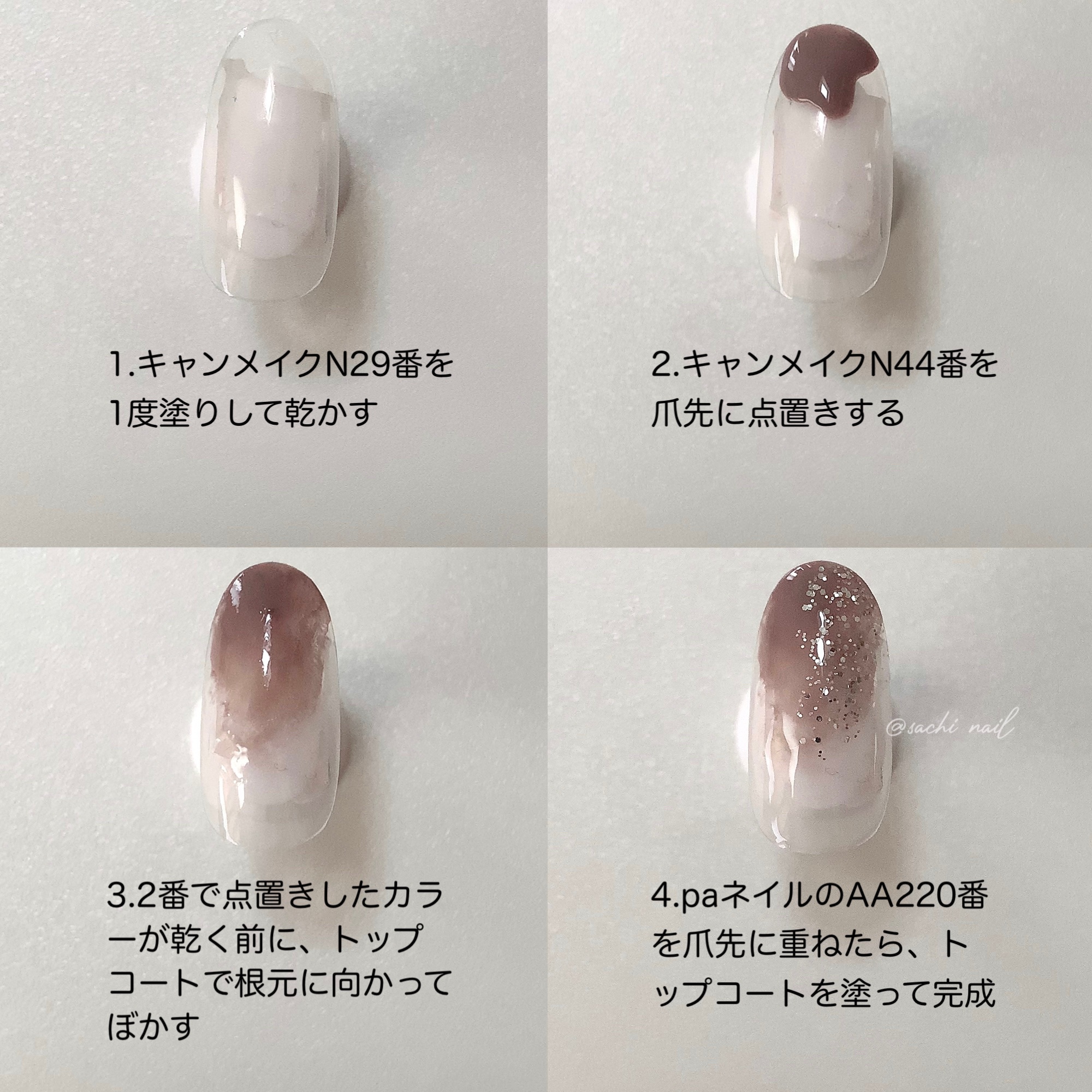 ワンカラーでも指ごとに色を変えるだけでオシャレに見えます💕 画像のようにゴールドラインとストーンを少し足すだけで華やかさがアップ🥰 何度かご紹介したことのあるスポンジで作るグラデーションです✨ スポンジを使うことで境目が綺麗に馴染んでくれます💕 アルミホイルの上でブラウンとトップコートを1:1くらいで混ぜたものを、トップコートのハケに取って3箇所に塗るだけ👌 事前に混ぜたものを塗ることで、爪の上でぼかすより簡単に出来ます💕 ベースカラーが乾く前に点置きしてぼかすことで綺麗にぼかせます✨ スピードが大事なので、使うポリッシュのキャップは全て開けておきましょう😊 天然石のラインはガタガタの方がより天然石っぽく見えるので、ラインを描くのが苦手な方でも大丈夫🙆♀️ 難しそうに見えて、やってみると意外と簡単に出来ます♡
