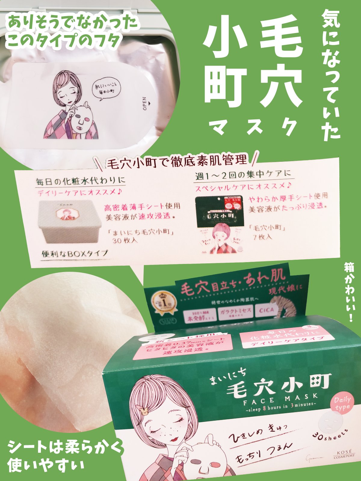 - 毎日の化粧水代わりに毛穴・あれ肌Wケアできる『まいにち毛穴小町マスク』 ①化粧水代わりのクイックケアで、毛穴・あれ肌Wケア たった3分のクイックケアで美容液がたっぷり浸透*✨ 水分・油分のバランスをととのえ、つるんとなめらかな陶器肌へみちびきます。 ②あれがちな肌にもやさしい使い心地 弱酸性・無着色・無鉱物油・パラベンフリー・紫外線吸収剤フリー・シリコーンフリー処方。やさしい使い心地です。 *角層まで