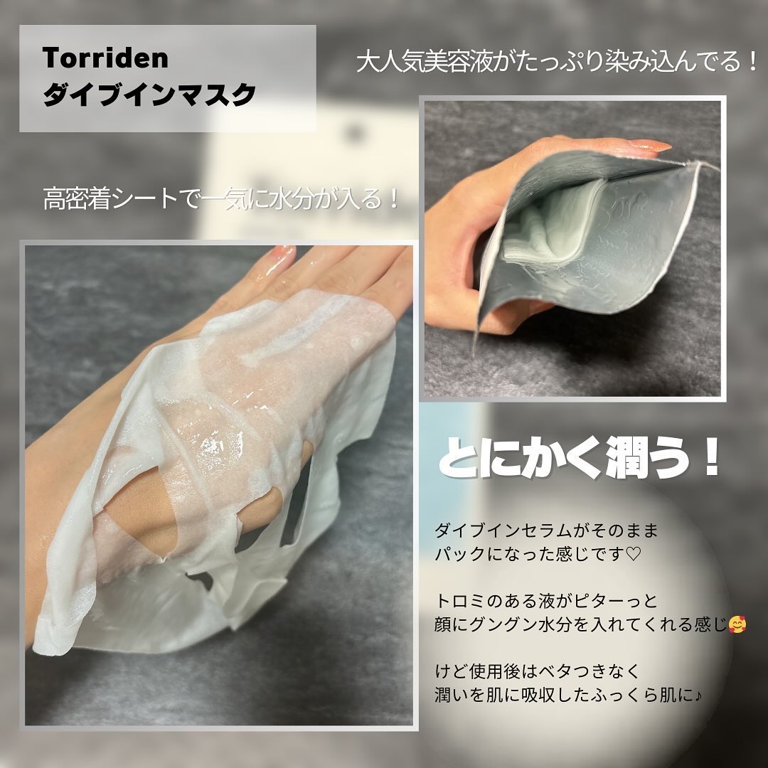 TorridenトリデンダイブインマスクLIPSでお試し購入👏1枚から購入できるのでちょっと試したいなと思う時にぴったりです😍どんな肌質にもあう水分パック...!シート自体は厚めのセルロース生地を使用🫧分厚めだからはがれるかなとドキドキしてま...