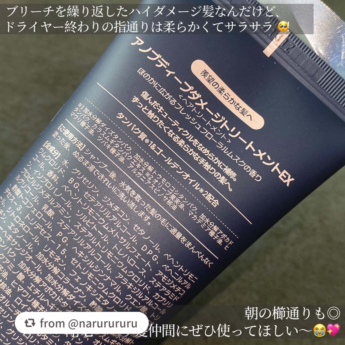 - <テンダーブルーム(フレッシュフローラルムスク)> 水、グリセリン、ジメチコン、セタノール、ベヘントリモニウムクロリド、BG、セテアリルアルコール、DPG、ベヘニルアルコール、香料、ベヘントリモニウムメトサルフェート、アモジメチコン、イソプロパノール、ソルビトール、トレハロース、ステアラミドプロピルジメチルアミン、ステアルトリモニウムクロリド、カプリリルグリコール、乳酸、ステアリルアルコール、アラキジルアルコール、酢酸トコフェロール、PG、ヘキシルシンナマル、クエン酸、トリデセス-3、トリデセス-15、セトリモニウムクロリド、ゲラニオール、シトロネロール、リモネン、フェノキシエタノール、加水分解ケラチン、エタノール、加水分解コラーゲン、酢酸、加水分解シルク、1,2-ヘキサンジオール、加水分解ダイズタンパク、加水分解トウモロコシタンパク、加水分解アボカドタンパク、カラスムギタンパクエキス、シルクアミノ酸、エチルヘキサンジオール、オリーブ果実油、マカデミア種子油、ヒマワリ種子油、システイン、ツバキ種子油、アルガニアスピノサ核油、ロイシン、バリン、タウリン、イソロイシン、アスパラギン酸、オルニチン、グルタミン酸、チロシン、トリプトファン、トレオニン、セリン、プロリン、フェニルアラニン、メチオニン、リシン、ヒスチジン、グリシン、グルタミン、シスチン、アスパラギン、アルギニン、アラニン <アノブ ディープダメージトリートメントEX テンダ―ブルームの香り> 水、ベヘニルアルコール、BG、グリセリン、ジメチコン、ソルビトール、フェノキシエタノール、香料、エタノール、PG、オリーブ果実油、アスパラギン酸、アルギニン、グリシン、セリン、アラニン、プロリン、バリン、イソロイシン、トレオニン、ヒスチジン、フェニルアラニン、カプリリルグリコール、セタノール、DPG、セテアリルアルコール、乳酸、ツバキ種子油、マカデミア種子油、加水分解コラーゲン、トレハロース、クエン酸、イソプロパノール、ステアリルアルコール、セトリモニウムクロリド、加水分解シルク、ベヘントリモニウムクロリド、酢酸トコフェロール、アルガニアスピノサ核油、アラキジルアルコール、1,2-ヘキサンジオール、ヒマワリ種子油、グルタミン酸、リシン、ロイシン、チロシン、タウリン、システイン、トリプトファン、加水分解ダイズタンパク、ステアラミドプロピルジメチルアミン、加水分解ケラチン、リモネン、シトロネロール、ゲラニオール、ステアルトリモニウムクロリド、エチルヘキサンジオール、メチオニン、グルタミン、酢酸、ヘキシルシンナマル、シルクアミノ酸、オルニチン、シスチン、アスパラギン、アモジメチコン、加水分解アボカドタンパク、ベヘントリモニウムメトサルフェート、カラスムギタンパクエキス、加水分解トウモロコシタンパク、トリデセス-3、トリデセス-15 <ウォームペタル> 水、ベヘニルアルコール、BG、グリセリン、ジメチコン、ソルビトール、フェノキシエタノール、香料、エタノール、PG、オリーブ果実油、アスパラギン酸、アルギニン、グリシン、セリン、アラニン、プロリン、バリン、イソロイシン、トレオニン、ヒスチジン、フェニルアラニン、カプリリルグリコール、セタノール、DPG、セテアリルアルコール、乳酸、ツバキ種子油、マカデミア種子油、加水分解コラーゲン、トレハロース、クエン酸、イソプロパノール、ステアリルアルコール、セトリモニウムクロリド、加水分解シルク、ベヘントリモニウムクロリド、酢酸トコフェロール、アルガニアスピノサ核油、アラキジルアルコール、1,2-ヘキサンジオール、ヒマワリ種子油、グルタミン酸、リシン、ロイシン、チロシン、タウリン、システイン、トリプトファン、加水分解ダイズタンパク、ステアラミドプロピルジメチルアミン、加水分解ケラチン、リモネン、シトロネロール、ゲラニオール、ステアルトリモニウムクロリド、エチルヘキサンジオール、メチオニン、グルタミン、酢酸、ヘキシルシンナマル、シルクアミノ酸、オルニチン、シスチン、アスパラギン、アモジメチコン、加水分解アボカドタンパク、ベヘントリモニウムメトサルフェート、カラスムギタンパクエキス、加水分解トウモロコシタンパク、トリデセス-3、トリデセス-15