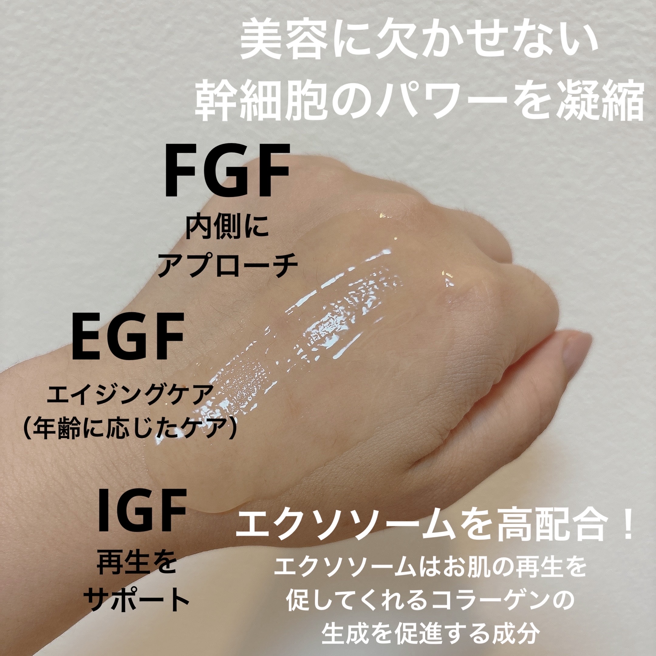 高濃度ヒト幹細胞培養液を15%も贅沢に配合している美容液とのこと。 紫外線ダメージやシミ・くすみケアが期待できるというアスタキサンチンも配合されているのだとか。 シワやたるみを改善する効果が期待できる美容成分で、レチノールよりも刺激が少なく、肌にはりを与えてくれると言われている「バクチオール」も配合という贅沢さ。