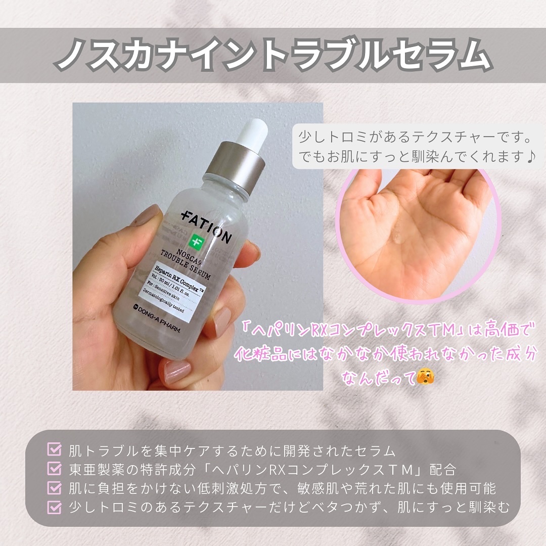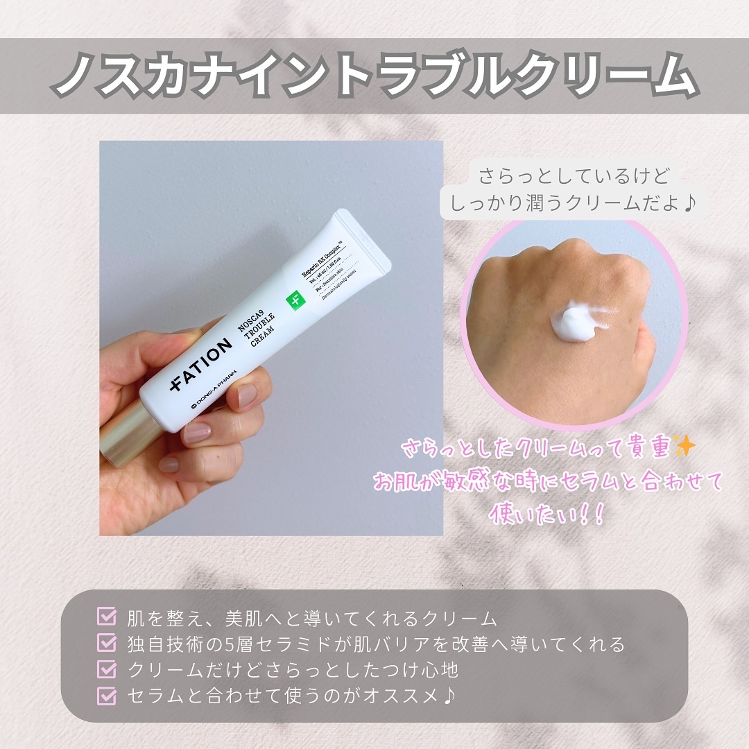 #FATION#ノスカナイントラブルセラム#ノスカナイントラブルクリーム#提供90年を超える韓国TOPの製薬会社の東亜製薬で9年間研究開発して作られたFATION(パティオン)のノスカナインラインです💚🌿パッケージが爽やかでオシャレです♡ニキ...