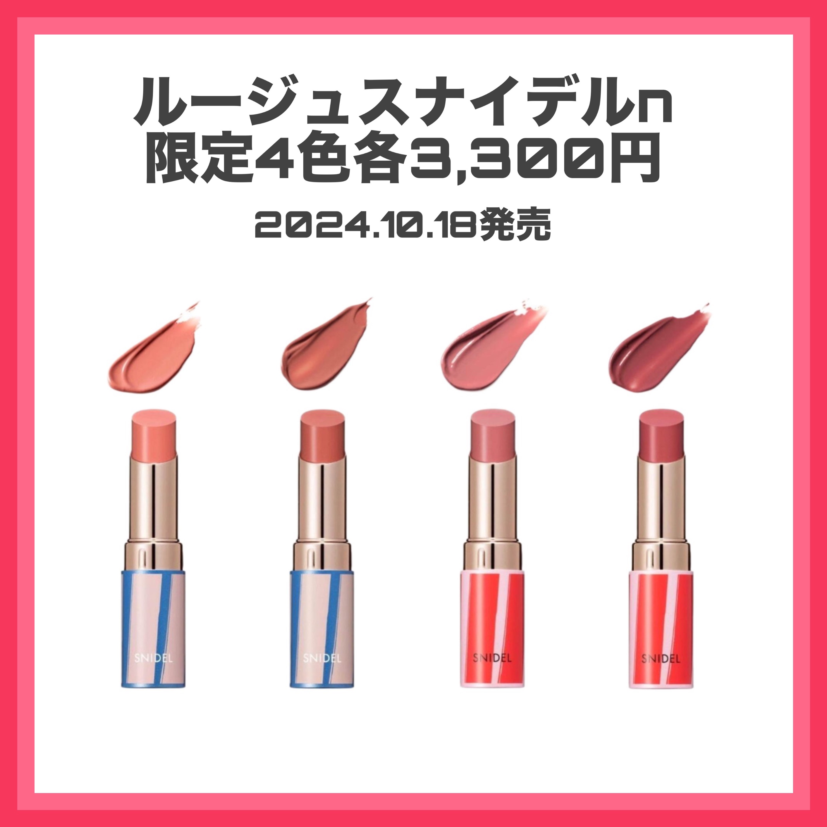 スナイデル ビューティの2024年クリスマスコフレ「Innocent Intention」をご紹介します♡ 全国発売日:2024年10月18日(金) 予約開始日:2024年10月4日(金) →SNIDEL ルージュ スナイデル n(限定4色)各¥3,300 ・EX02 Cheeky Beige ・EX03 Velvet Cinnamon ・EX04 Dolly Pink ・EX05 Innocent Rose