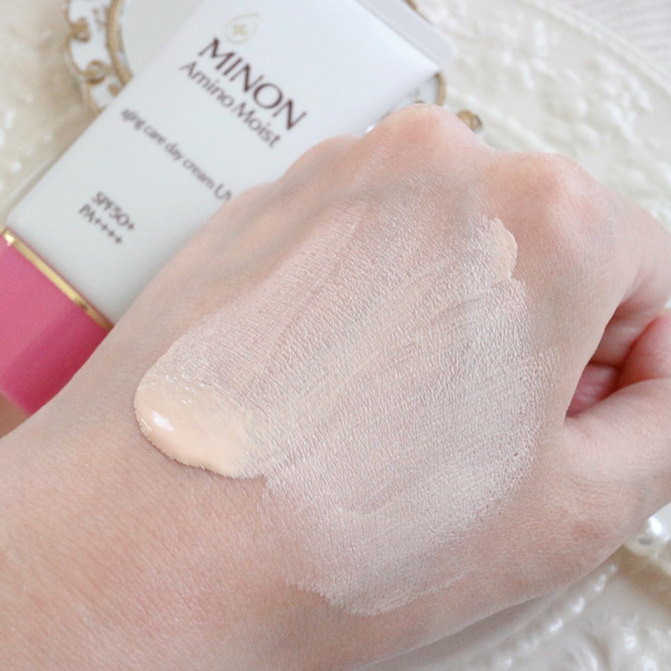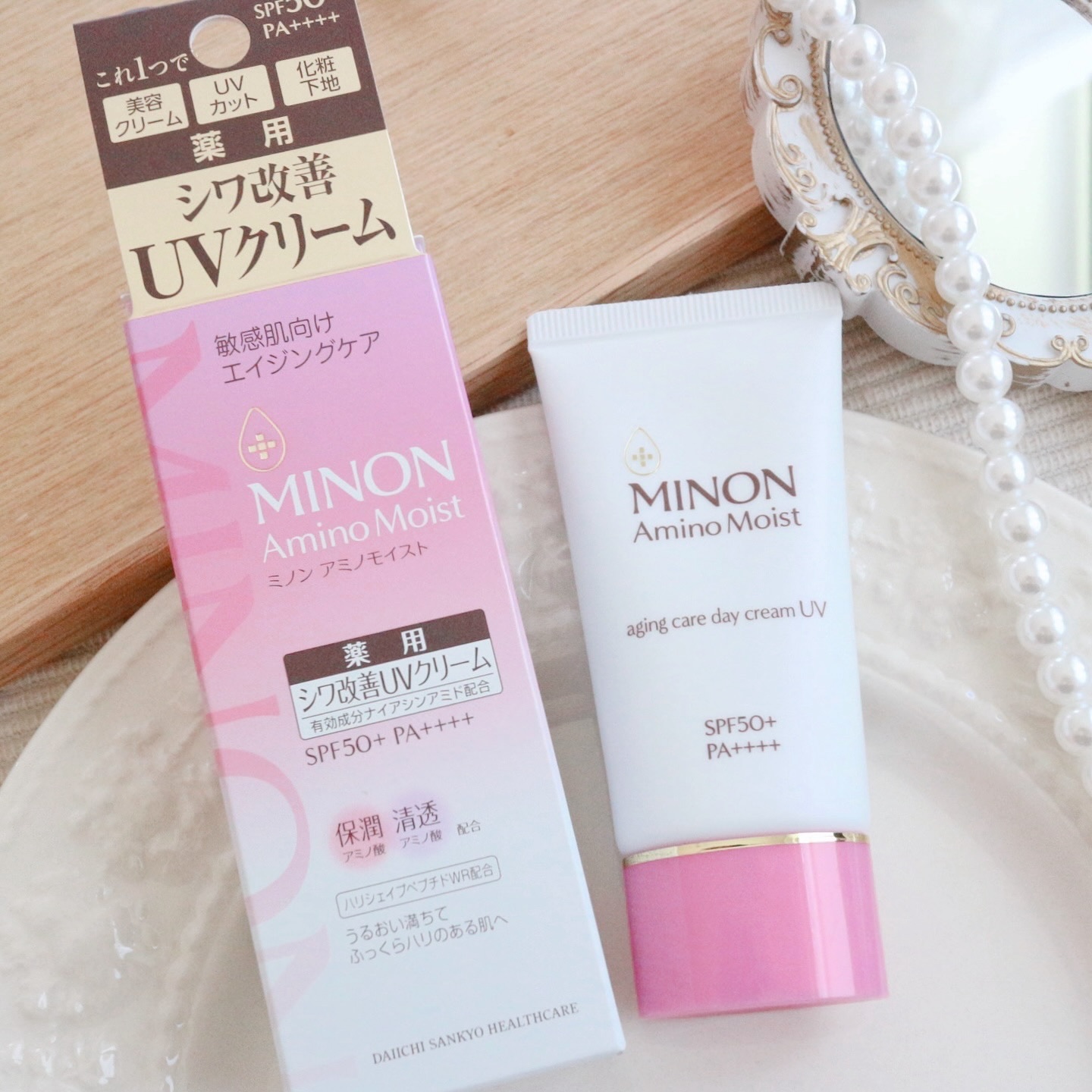 - 【シワ改善もできるUVクリーム】 SPF50+PA++++ シワ改善×UVカットが出来る薬用シワ改善UVクリーム。これ1本で美容クリーム・UVカット・化粧下地の3役。 シワ改善&しみ*予防成分「ナイアシンアミド」、肌あれ予防成分「グリチルリチン酸2K」配合。紫外線吸収剤&酸化亜鉛フリーで敏感肌を考えた処方。自然な輝きを放つ、やわらかなテクスチャーの化粧下地、見る角度で反射色が変わる「艶肌ダブルカラーパウダー」配合で自然な立体感を演出。 エイジングケア:年齢に応じたお手入れケア *メラニンの生成を抑え、しみ・そばかすを防ぐ (販売名:ミノンアミノモイストAU)【医薬部外品】