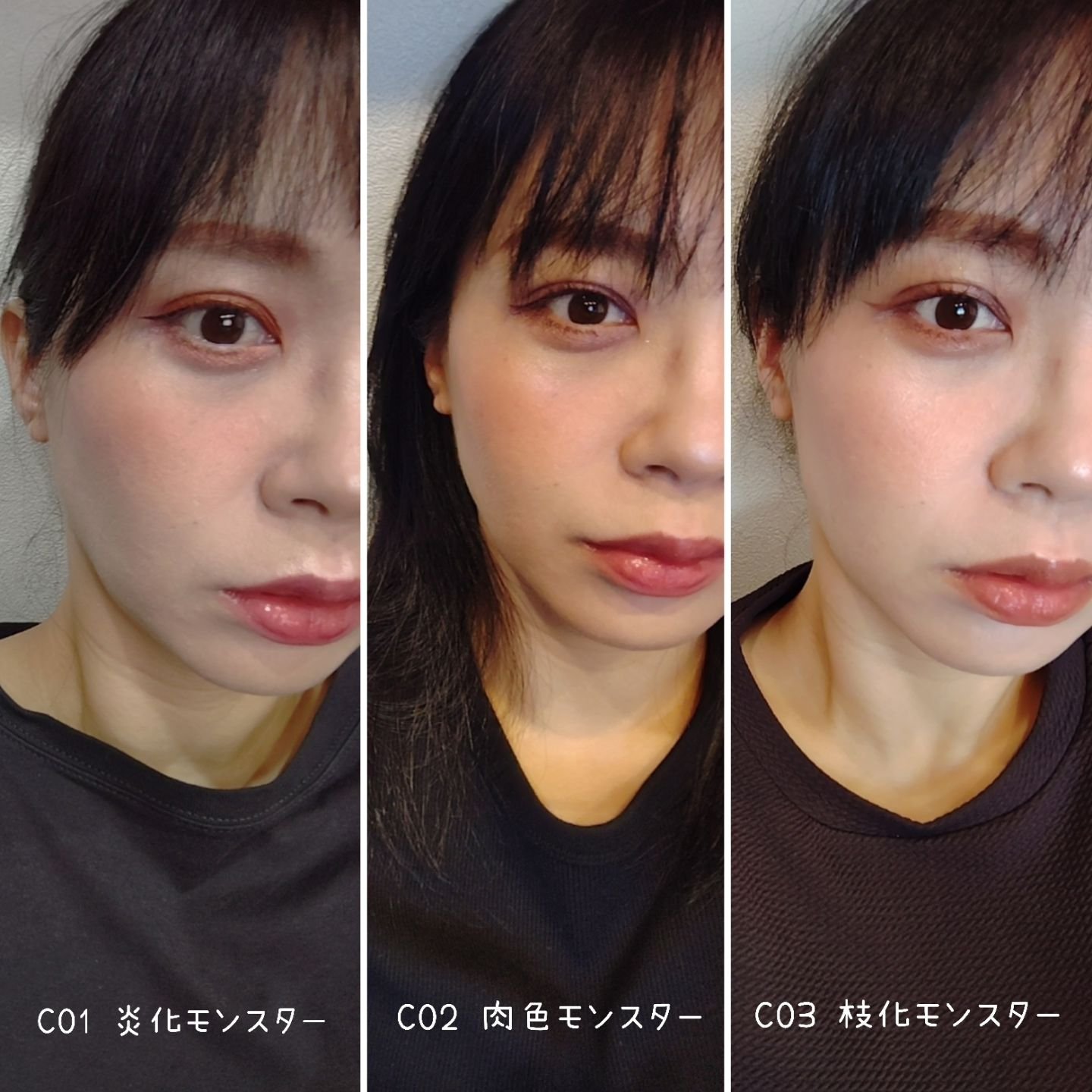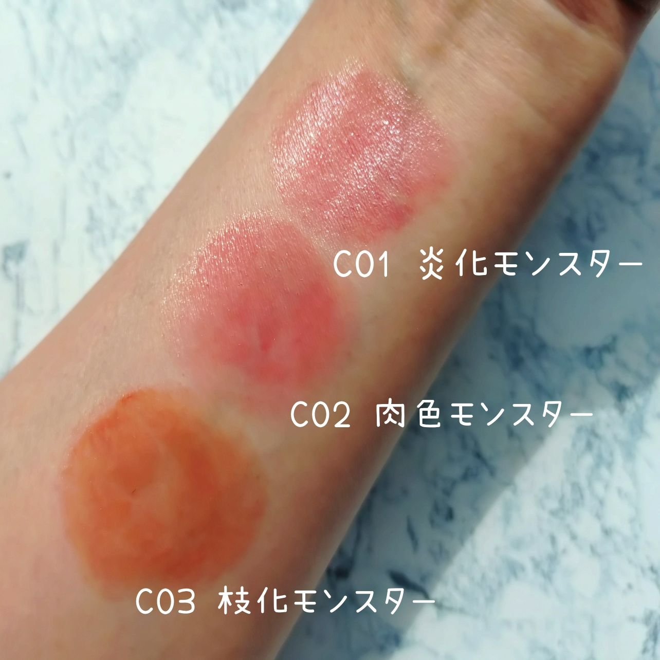 - <C01 炎化モンスター> テトライソステアリン酸ジペンタエリスリチル、オクチルドデカノール、トリ(カプリル酸/カプリン酸)グリセリル、イソノナン酸イソトリデシル、ラウロイルグルタミン酸ジ(フィトステリル/オクチルドデシル)、ビスアルキル(C16-18)グリセリルウンデシルジメチコン、パラフィン、水添ポリイソブテン、合成ワックス、ダイマージリノール酸(フィトステリル/イソステアリル/セチル/ステアリル/ベヘニル)、ラウロイルグルタミン酸ジ(オクチルドデシル/フィトステリル/ベヘニル)、マイクロクリスタリンワックス、水添マイクロクリスタリンワックス、トコフェロール、ホホバ種子油、オリーブ果実油、アーモンド油、ヒドロキシステアリン酸エチルヘキシル、(エチレン/プロピレン)コポリマー、ポリエチレン、(+/-)(チタン/酸化チタン)焼結物、マイカ、ラウロイルアスパラギン酸Na、ラウロイルリシン、塩化亜鉛、酸化鉄、硫酸Ba、トリイソステアリン酸イソプロピルチタン、赤202 <C02 肉色モンスター> テトライソステアリン酸ジペンタエリスリチル、オクチルドデカノール、トリ(カプリル酸/カプリン酸)グリセリル、イソノナン酸イソトリデシル、ラウロイルグルタミン酸ジ(フィトステリル/オクチルドデシル)、ビスアルキル(C16-18)グリセリルウンデシルジメチコン、パラフィン、水添ポリイソブテン、合成ワックス、ダイマージリノール酸(フィトステリル/イソステアリル/セチル/ステアリル/ベヘニル)、ラウロイルグルタミン酸ジ(オクチルドデシル/フィトステリル/ベヘニル)、マイクロクリスタリンワックス、水添マイクロクリスタリンワックス、トコフェロール、ホホバ種子油、オリーブ果実油、アーモンド油、ヒドロキシステアリン酸エチルヘキシル、(エチレン/プロピレン)コポリマー、ポリエチレン、ジメチコン、(+/-)(チタン/酸化チタン)焼結物、マイカ、ラウロイルアスパラギン酸Na、ラウロイルリシン、塩化亜鉛、酸化チタン、酸化鉄、水酸化Al、硫酸Ba、トリイソステアリン酸イソプロピルチタン、赤202 <C03 枝化モンスター> テトライソステアリン酸ジペンタエリスリチル、オクチルドデカノール、トリ(カプリル酸/カプリン酸)グリセリル、イソノナン酸イソトリデシル、ラウロイルグルタミン酸ジ(フィトステリル/オクチルドデシル)、ビスアルキル(C16-18)グリセリルウンデシルジメチコン、パラフィン、水添ポリイソブテン、合成ワックス、ダイマージリノール酸(フィトステリル/イソステアリル/セチル/ステアリル/ベヘニル)、ラウロイルグルタミン酸ジ(オクチルドデシル/フィトステリル/ベヘニル)、マイクロクリスタリンワックス、水添マイクロクリスタリンワックス、トコフェロール、ホホバ種子油、オリーブ果実油、アーモンド油、ヒドロキシステアリン酸エチルヘキシル、(エチレン/プロピレン)コポリマー、ポリエチレン、ジメチコン、(+/-)(チタン/酸化チタン)焼結物、マイカ、ラウロイルアスパラギン酸Na、ラウロイルリシン、塩化亜鉛、酸化チタン、酸化鉄、水酸化Al、硫酸Ba、トリイソステアリン酸イソプロピルチタン、赤202