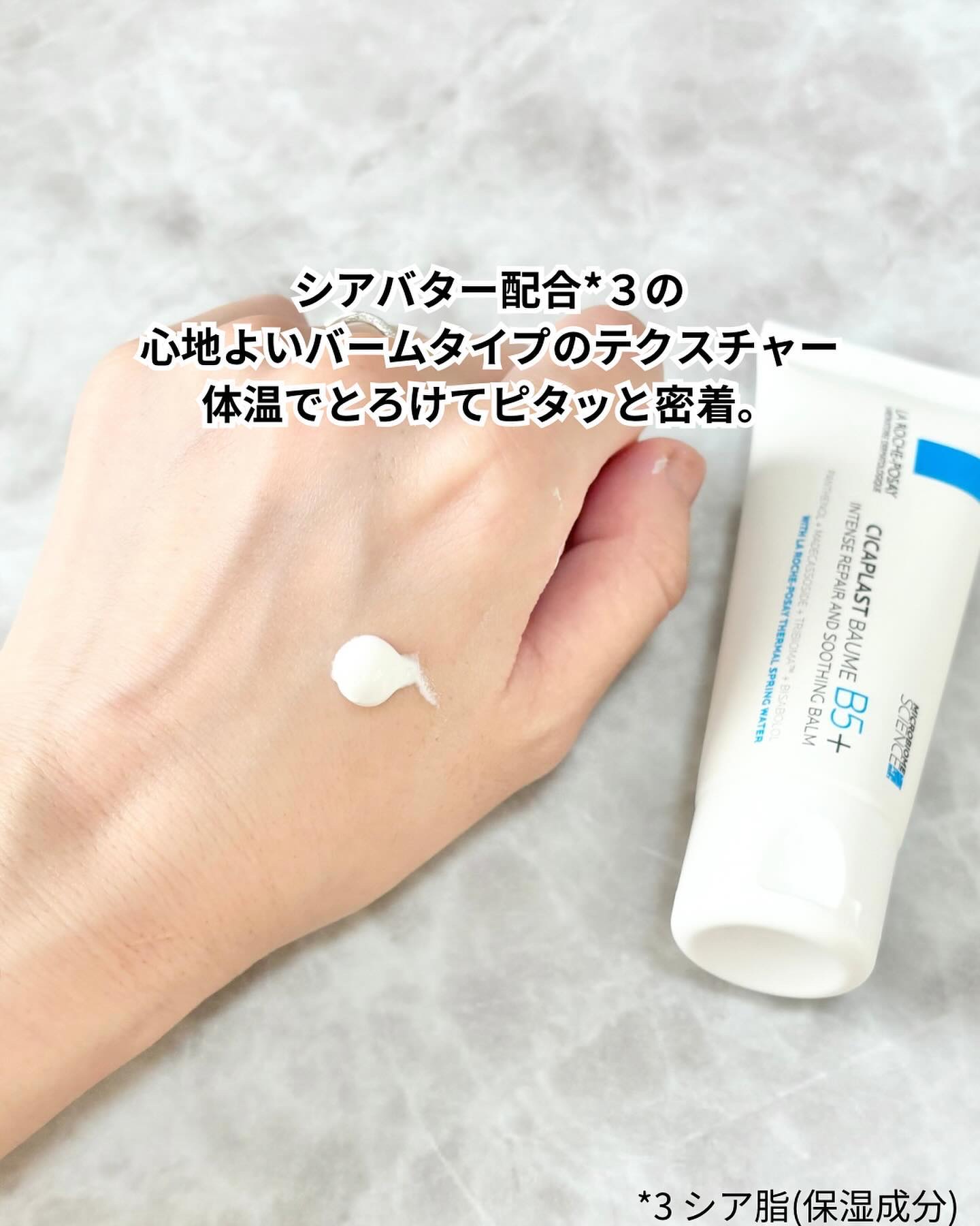 - 塗るだけSOSシールド うるおいの先、肌荒れ予防やダメージケア*1まで。 ①7種の肌悩み*2に。肌ダメージ*1を速攻ケア*3 ②独自のダーマCICAテクノロジー*4採用。 CICA成分*5、パンテノールB5*6、独自成分トリバイオーマ*7配合。 ③長時間*8見えない刺激*1から守るセカンドスキンシールド*9 *1 乾燥による *2カサつき、乾燥による肌荒れ防止、乾燥によるくすみ、キメの乱れ、乾燥ガサガサ肌への保湿、美容トリートメント後(肌管理後)、花粉などの飛散物汚れからの肌保護 *3 お手入れにより *4 ツボクサ葉エキス、α-グルカンオリゴサッカリド、ポリム二アソンチホリア根汁、乳酸桿菌、マンノース(全て整肌成分)、パンテノール(保湿・整肌成分) *5 ツボクサ葉エキス(整肌成分) *6 パンテノール(保湿・整肌成分) *7 α-グルカンオリゴサッカリド、ポリム二アソンチホリア根汁、乳酸桿菌、マンノース(全て整肌成分) *8 ラ ロッシュ ポゼ調べ。個人差があります。 *9 化粧膜