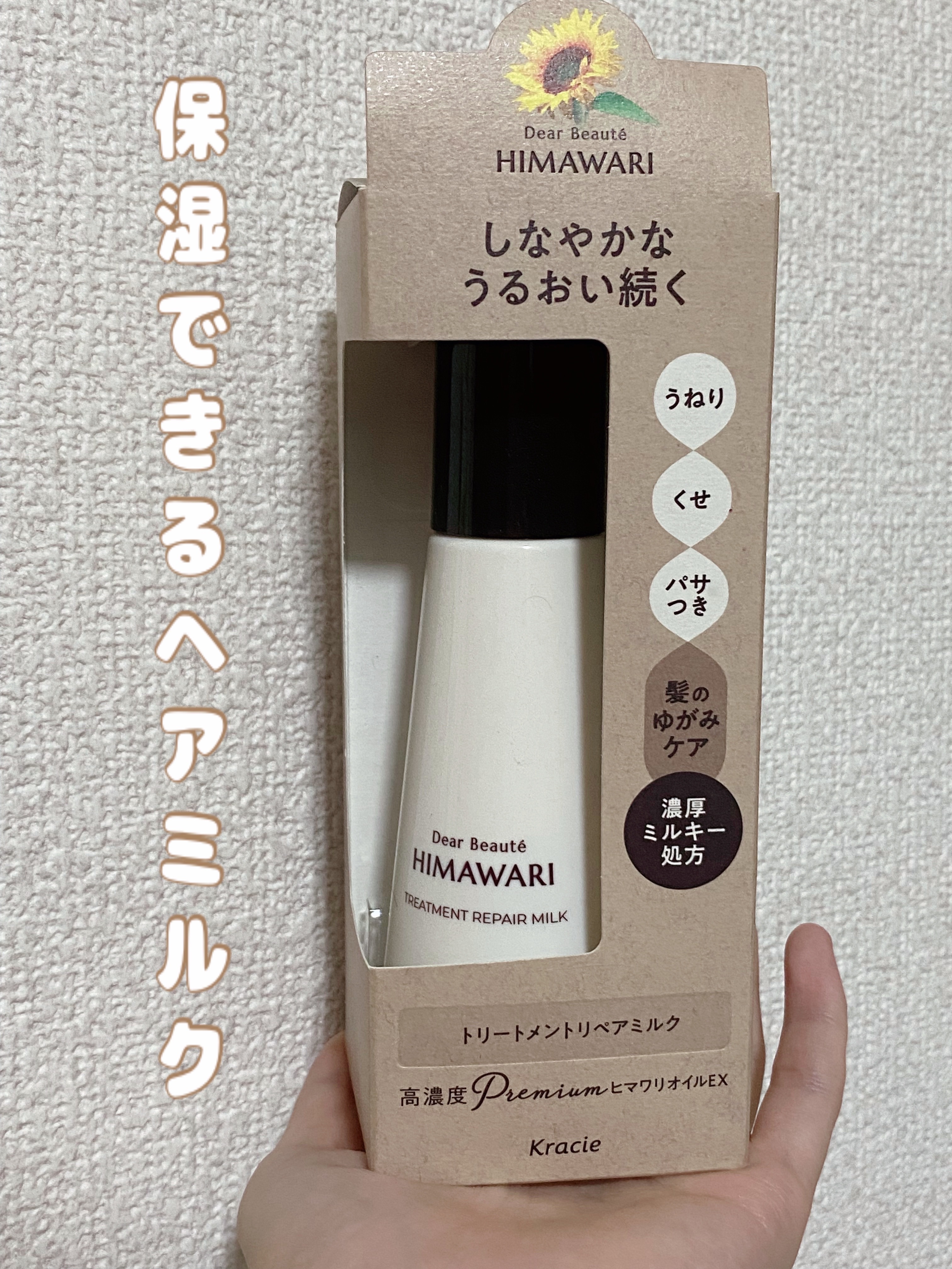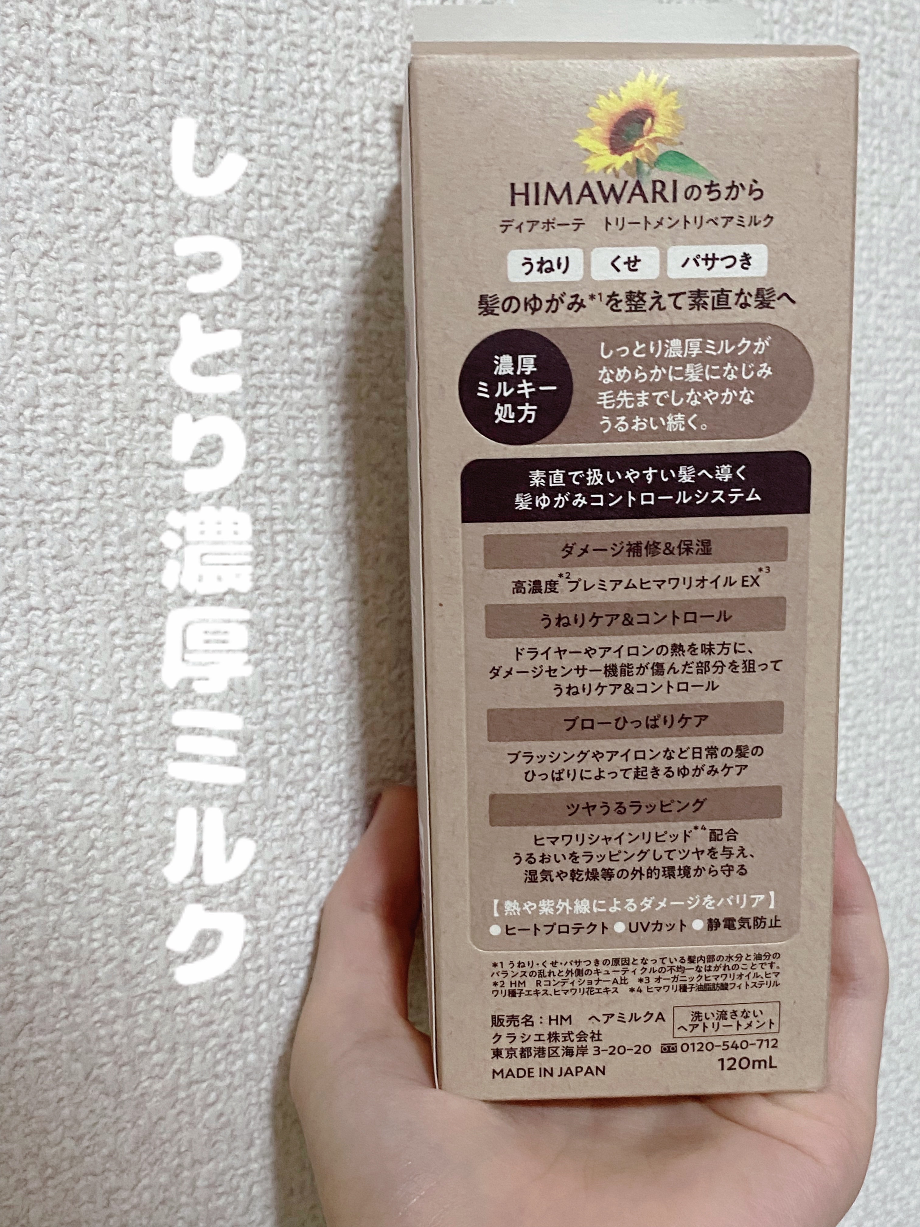 - ※2024年9月30日、リニューアル。 ●髪のゆがみ*1をケアして、素直な髪へ導くヘアケアブランド ●毛先までしなやかなうるおい続くミルクタイプの洗い流さないトリートメント ●濃厚ミルキー処方 ●素直で扱いやすい髪へ導くゆがみ*1ケアシステム ●ダメージ補修&保湿成分「高濃度*2プレミアムヒマワリオイルEX*3」配合 ●熱を味方に毛髪と結合し、髪の外側をコート ●浸透サポート成分(セバシン酸ジエチル)配合で、成分を髪内部に素早く浸透 ●ブローひっぱりケア ●「ヒマワリシャインリピッド*4」を配合した「ツヤうるラッピング」 ●ヒートプロテクト ●UVカット ●静電気防止 ●陽だまりのあたたかさと透き通ってさわやかなエレガントフローラルの香り *1:うねり・くせ・パサつきの原因となっている髪内部の水分と油分のバランスの乱れと外側のキューティクルの不均一なはがれのこと *2:HM RコンディショナーA比 *3:オーガニックヒマワリオイル、ヒマワリ種子エキス、ヒマワリ花エキス *4:ヒマワリ種子油脂肪酸フィトステリル(うるおい成分)