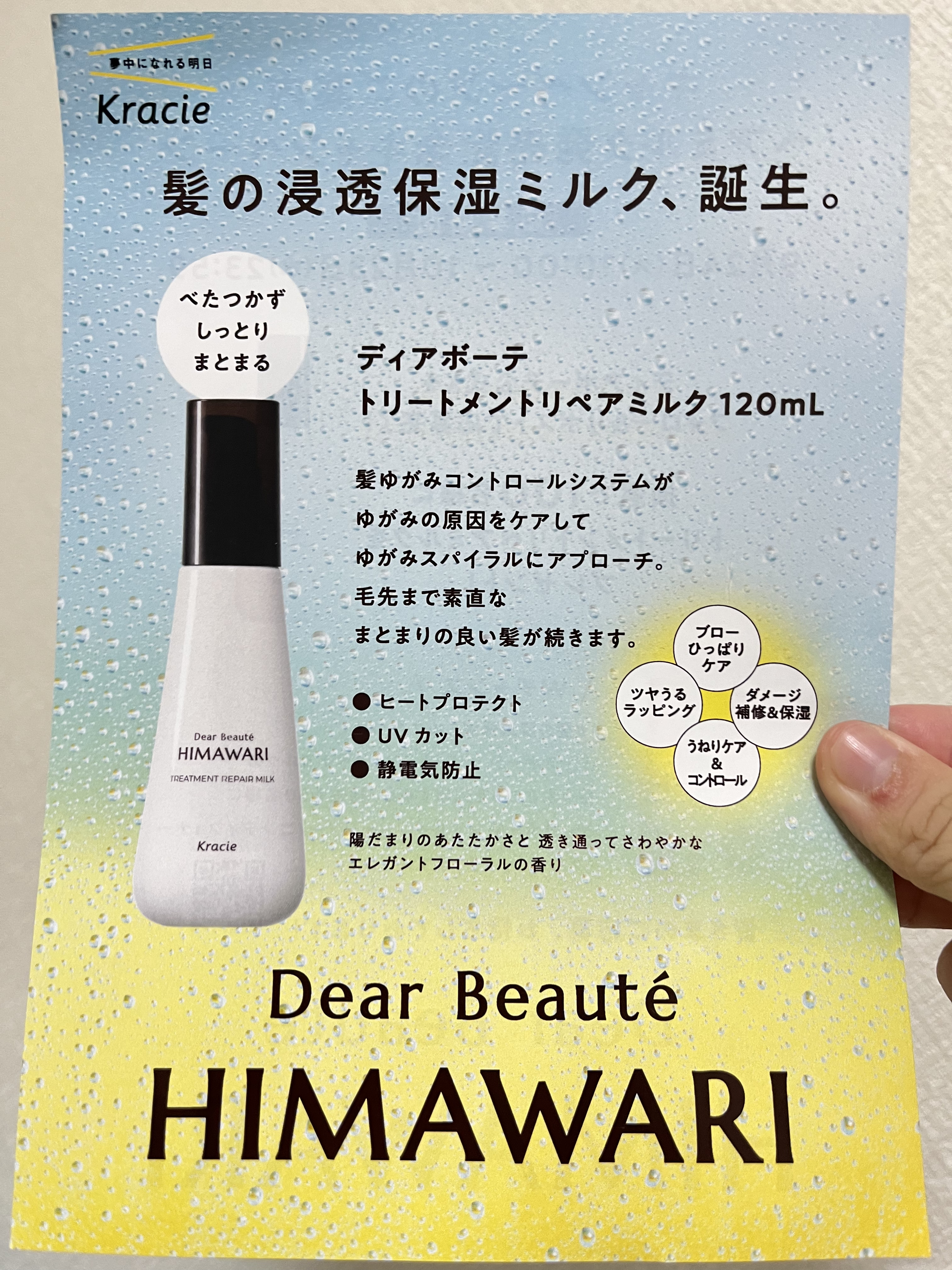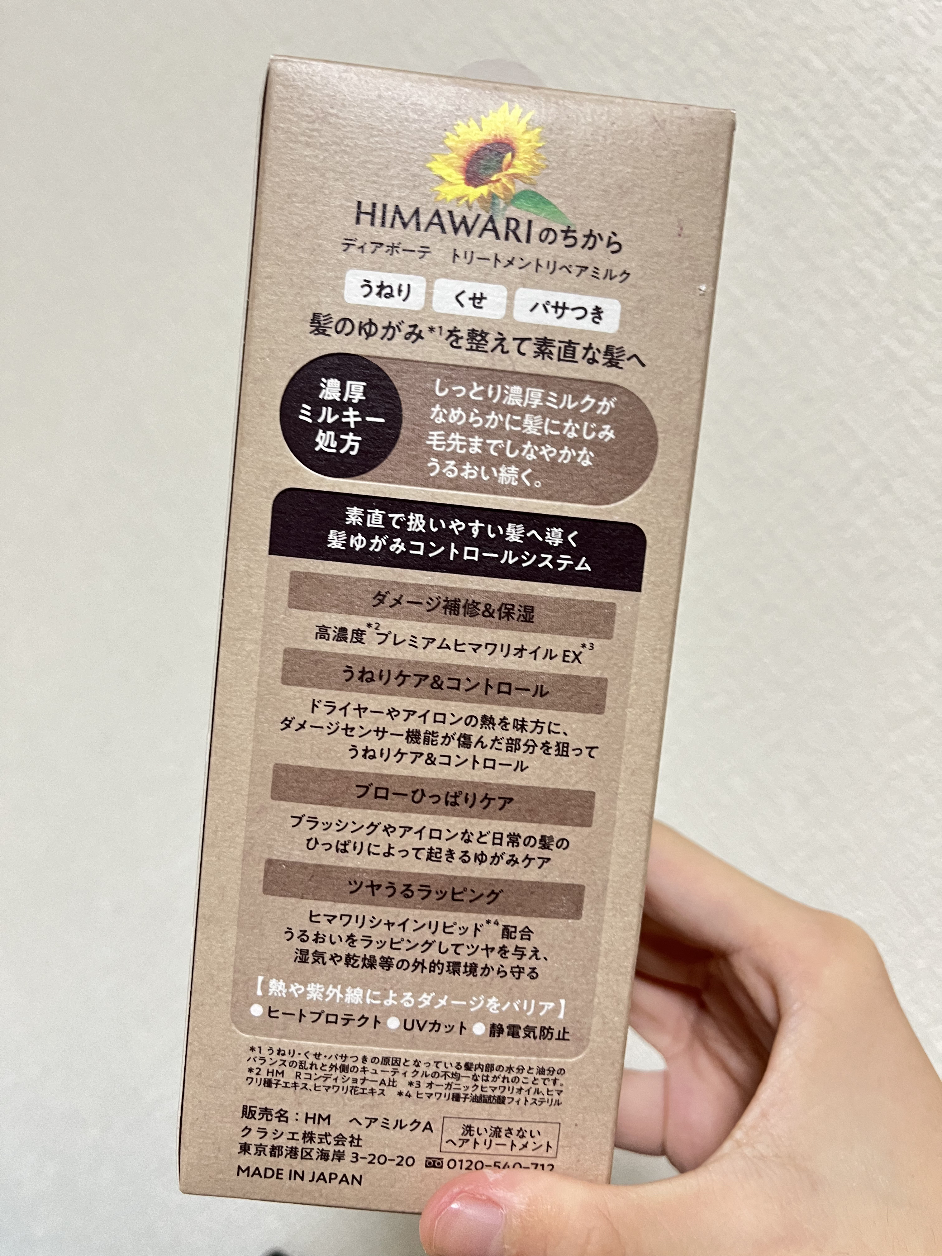 - ※2024年9月30日、リニューアル。 ●髪のゆがみ*1をケアして、素直な髪へ導くヘアケアブランド ●毛先までしなやかなうるおい続くミルクタイプの洗い流さないトリートメント ●濃厚ミルキー処方 ●素直で扱いやすい髪へ導くゆがみ*1ケアシステム ●ダメージ補修&保湿成分「高濃度*2プレミアムヒマワリオイルEX*3」配合 ●熱を味方に毛髪と結合し、髪の外側をコート ●浸透サポート成分(セバシン酸ジエチル)配合で、成分を髪内部に素早く浸透 ●ブローひっぱりケア ●「ヒマワリシャインリピッド*4」を配合した「ツヤうるラッピング」 ●ヒートプロテクト ●UVカット ●静電気防止 ●陽だまりのあたたかさと透き通ってさわやかなエレガントフローラルの香り *1:うねり・くせ・パサつきの原因となっている髪内部の水分と油分のバランスの乱れと外側のキューティクルの不均一なはがれのこと *2:HM RコンディショナーA比 *3:オーガニックヒマワリオイル、ヒマワリ種子エキス、ヒマワリ花エキス *4:ヒマワリ種子油脂肪酸フィトステリル(うるおい成分)