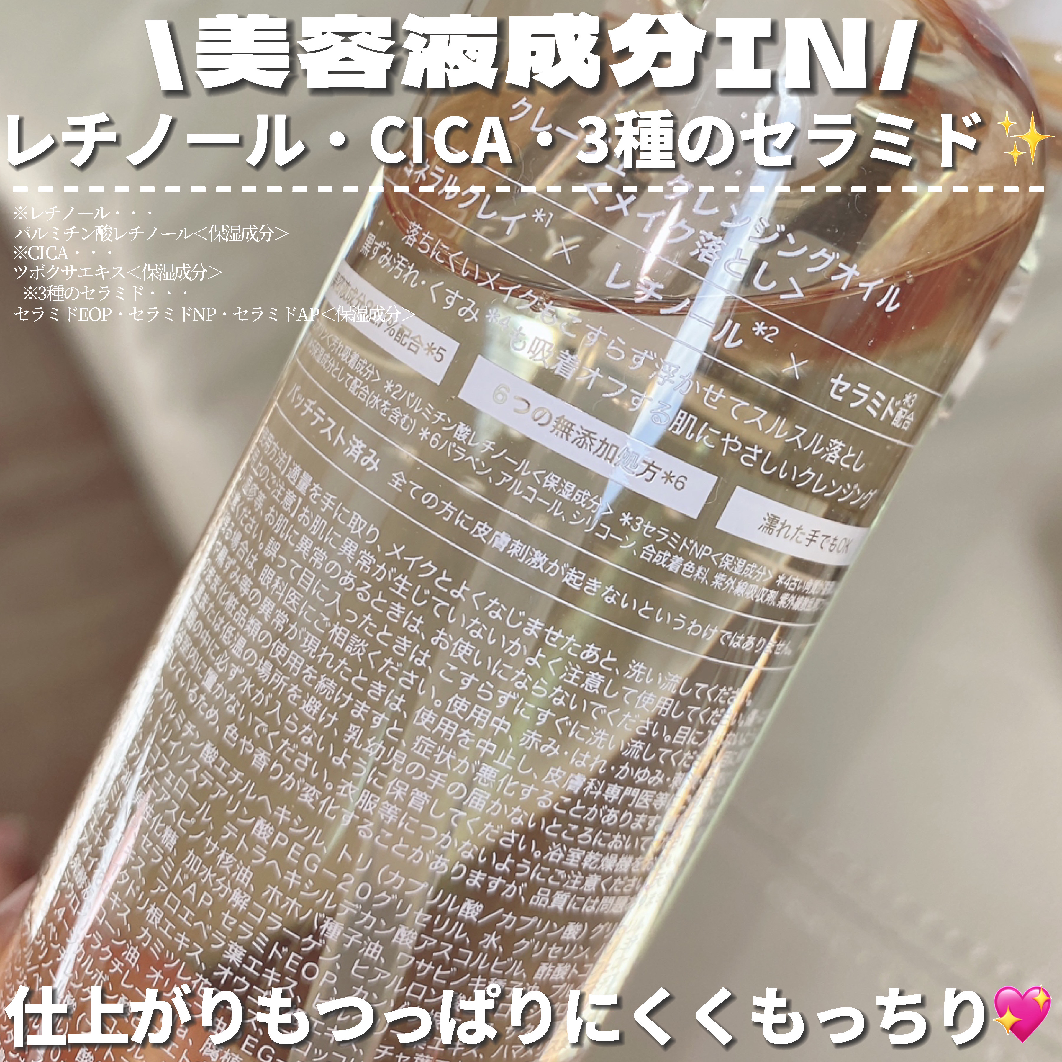 - クレイ×レチノール×セラミド配合。落ちにくいメイクもこすらず浮かせてスルスル落とし、皮脂汚れ・くすみも同時に吸着オフするクレンジングオイル。 厳選ブレンドしたミネラルオイルとオーガニックオイルを独自処方でエマルジョン化したことで、水にも油にも馴染みやすくなり普段落ちにくいメイクもこすらず浮かせてスッキリ落とします。 また、ミネラル豊富なクレイ成分で皮脂汚れを吸着オフし、3種のビタミン成分(レチノール、ビタミンC誘導体、ビタミンE)やコラーゲンがくすみや毛穴悩みにもアプローチ。 洗うたびに透明感あふれる肌に。 3種のセラミドやヒアルロン酸、CICA成分などの整肌成分も配合することで、クレンジングオイルなのに洗い上りは突っ張らず、なめらかで肌にやさしい洗い心地に。 W洗顔不要、濡れた手OK。
