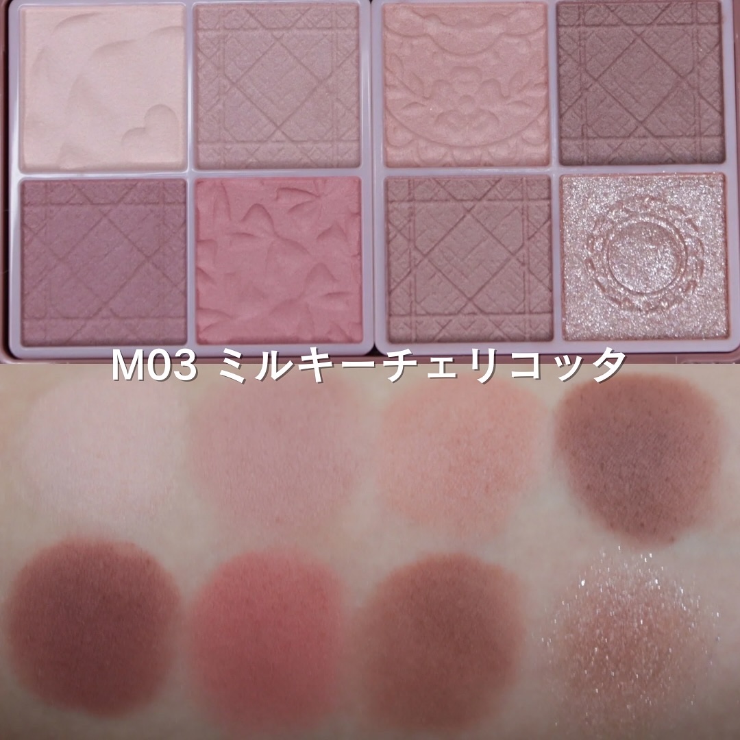 待望のマットタイプが登場するよ! 同系色が揃った、捨て色なしの8色入った贅沢パレット♡ ミルキーチェリコッタはおしゃれなコーラルブラウン! まろやかで絶妙な赤みが可愛いすぎる! キラッキラしてるんだけど派手すぎない、 繊細な輝きに虜になってまう🥺
