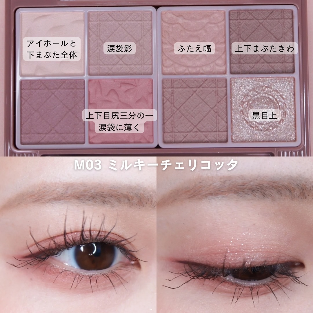 - いつでも一緒♡多色なのに持ち歩ける! 8色入りアイシャドウパレットのマットタイプ♪ 多色パレットでありながら、「持ち歩けること」と「外出先でもメイク直しができること」にこだわったアイシャドウパレット。 ダブルエンドチップ付です♪ マットが大好きな方にも、少し苦手意識がある方にも手に取っていただきたく全色マットor1色ラメ入りの構成にしています♪ (M01:全色マット、M02・M03:1色ラメ入り) 全体は同系色で統一しており、全色使いやすいパレット。 色の組み合わせは自由に♡自分好みのメイクを楽しめます! 【マット】 隠ぺい感とふわっと感を両立させた質感♪ なめらかで重ねても粉っぽくなりにくく、厚塗り感のない仕上がり。 伸びが良いのでムラになりにくく、しっとりフィットして仕上がりを長時間キープ✨ 【ラメ】 ラメ・パールだけがのる透明感のある仕上がり。 高輝度なガラスパール配合で、高見えする輝き✨ なめらかで粉っぽくならず、しっとり密着して仕上がりを長時間キープ! サラサラしたマットシャドウにもラメがしっかり密着する処方を追求しました♪ 蓋にはマット感を表現したすりガラス風のグラデーションデザインが、パウダー部分にはリボンやレース・ボタンの型押しが入っているなど、デザインにもこだわっています♡