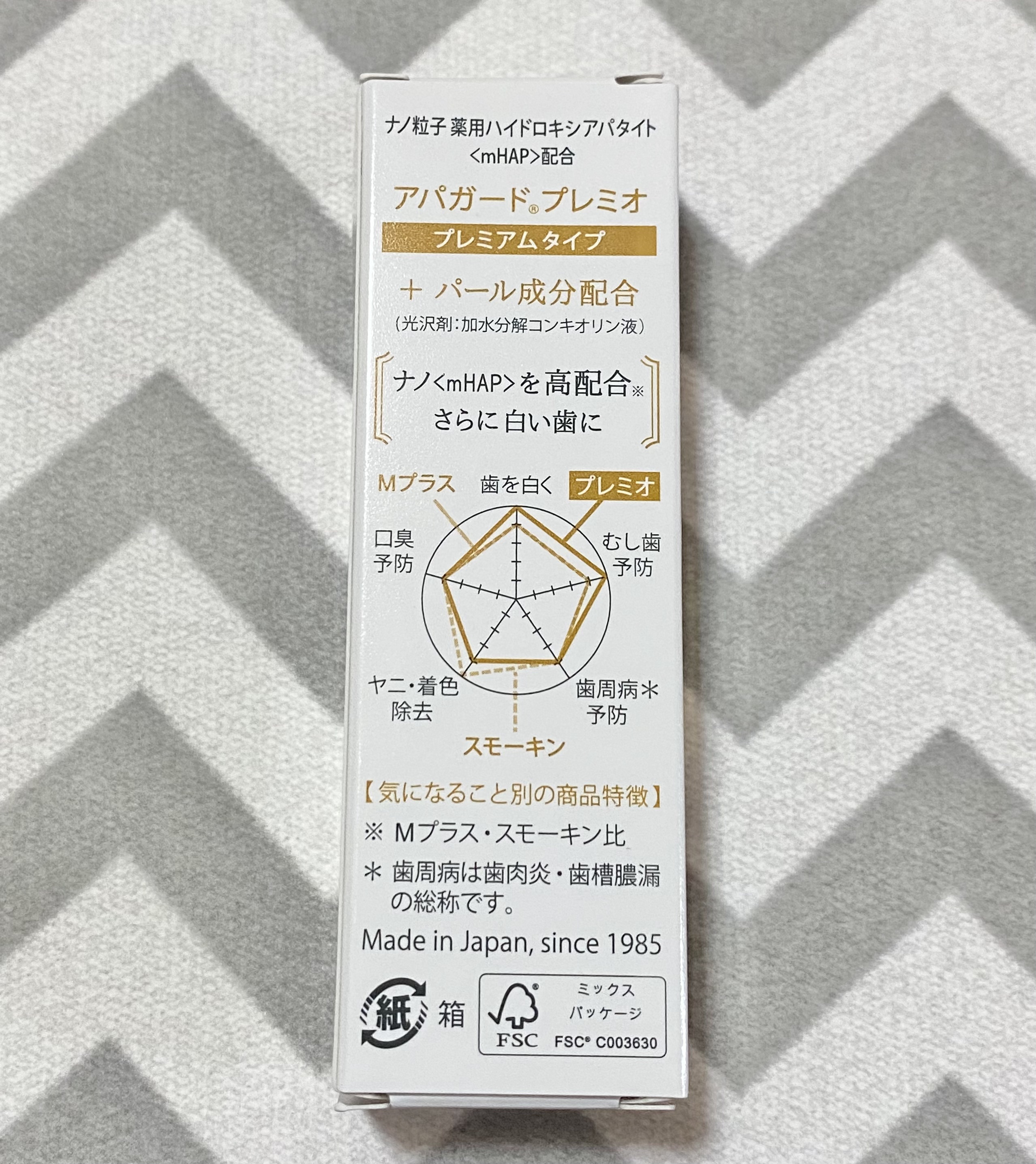 - 【医薬部外品】 独自成分「薬用ハイドロキシアパタイト」がエナメル質を整えてむし歯を予防。アパガードはエナメル質の健康を保つことで自然な白い歯に導く美白歯みがきブランド。アパガードプレミオは「薬用ハイドロキシアパタイト」を高配合(スタンダードタイプ比)。プレミアムケアでときめく白い歯に。 <ライトミント> ●サンギ独自の薬用成分ナノ粒子「薬用ハイドロキシアパタイト」を高配合したプレミアムタイプ。※Mプラス、スモーキン比 ●歯の再石灰化率、白色度もアップ。 ●歯垢を吸着除去し、歯のエナメル質の目に見えない傷を埋め、ミネラル欠損部(初期むし歯)を再石灰化するナノ<mHAP>の3つの働きで、むし歯を予防。 ●パール成分(加水分解コンキオリン液)配合。 <エクストラミント> ●強めのミントがお好みの方におススメ!ミント強めの「エクストラミント」フレーバー。 ●サンギ独自の薬用成分ナノ粒子「薬用ハイドロキシアパタイト」を高配合したプレミアムタイプ。※Mプラス、スモーキン比 ●歯垢を吸着除去、エナメル質表面の目に見えない傷を埋めてなめらかに、エナメル質から溶け出したミネラルを補給(再石灰化)する、という薬用ハイドロキシアパタイトの3つの作用でむし歯を予防。 ●パール成分(加水分解コンキオリン液)を追加したブライトニング処方