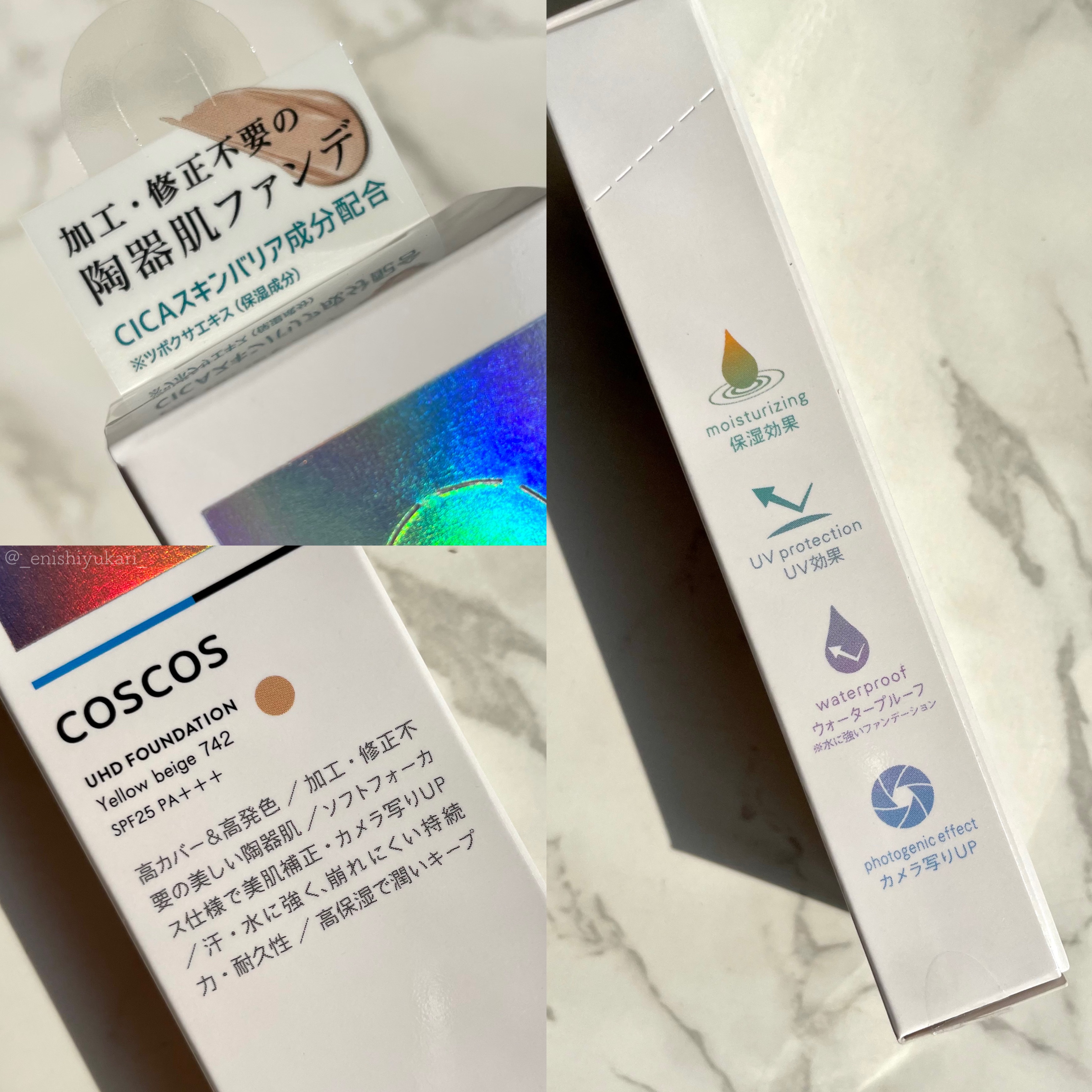 - 高カバー&高発色で肌の悩みをカバーし、陶器のようなツルンとしたお肌に仕上げる〈COSCOS UHDファンデーション〉。 『カバー力』『写真写り』『仕上がり』『持続力』にこだわり抜いた質感・使用感はSNSへUPする写真の加工や修正の手間を省く肌映えの仕上がりを実現します。 UHDファンデーション742(イエローベージュ)は、健康的なクールな印象の肌に導きます。 ●カラー:イエローベージュ イエロー寄りの色みをベースに健康的なクールな印象の肌へ (旧パッケージ「Mナチュラル02」と同じカラーです) ●コンプレックスを隠す”高カバー&高発色” 伸びが良いのにカバー力が高く、ツルンとした陶器肌へ セミマットな仕上がりがよりナチュラルな美しさを引き出します ●ソフトフォーカス効果 フォトグラフィックパウダー(※1)を新配合し、毛穴をカバーして美肌フィルターをかけたようなキメ細かい立体感のある肌に ●汗・水に強い「持続力・耐久力」 ウォータープルーフ効果で汗をかいても崩れにくく、時間がたってもくすまず美しい仕上がり ●注目の「CICA(※2)スキンバリア成分」配合 CICA(※2)スキンバリア成分を新たに配合し、メイクしながらしっかりお肌を守るスキンケア効果をプラス ●UV効果 SPF25PA++紫外線からお肌を守る ※1:酸化チタン、マイカ、シリカ、酸化鉄(感触改良剤) ※2:ツボクサエキス(保湿成分)