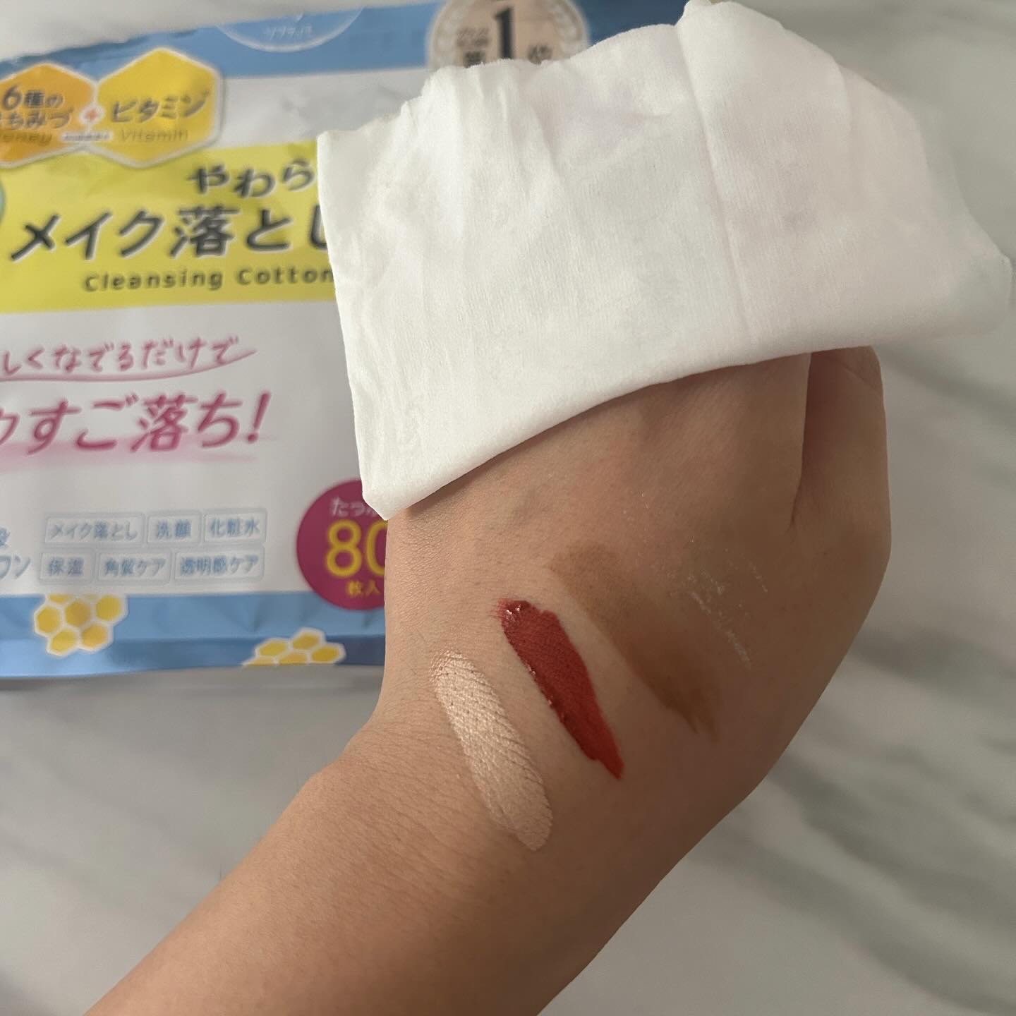 やさしくなでるだけでメイクをしっかり落とす、オールインワンクレンジングシートです。メイク落とし、洗顔、化粧水、保湿、角質ケア、透明感ケアの6役のクレンジングコットンシート。 1枚でしっかり落とせる大判タイプで、たっぷり使える大容量80枚入なのもうれしいです。 やや薄めのシートで、やわらかい肌触りです。シトラスハニーの甘く爽やかな香り。
