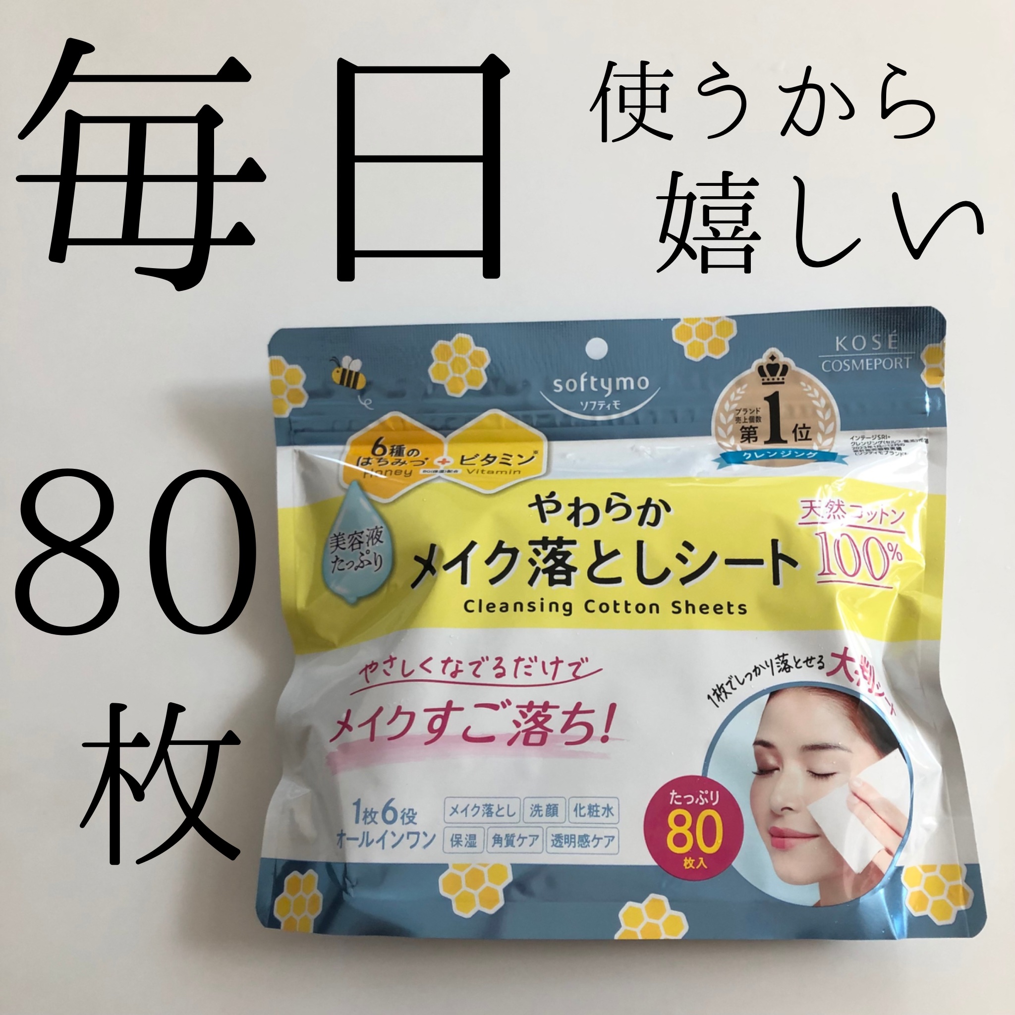 - 1枚6役のオールインワンクレンジングコットン。 やさしくなでるだけで、毛穴や肌のキメに入り込んだメイクもしっかり落とします。 保湿成分をギュッとつめこんだ美容液で、メイクを落としながらうるおいをあたえ、透明感のある肌に。 1枚でしっかり落とせる大判シート&たっぷり大容量。 ※クレンジング売上個数第1位.....インテージSRI+ クレンジング(セルフ・薬系)市場2023年1月~12月の累計販売個数実績(ソフティモブランド計)
