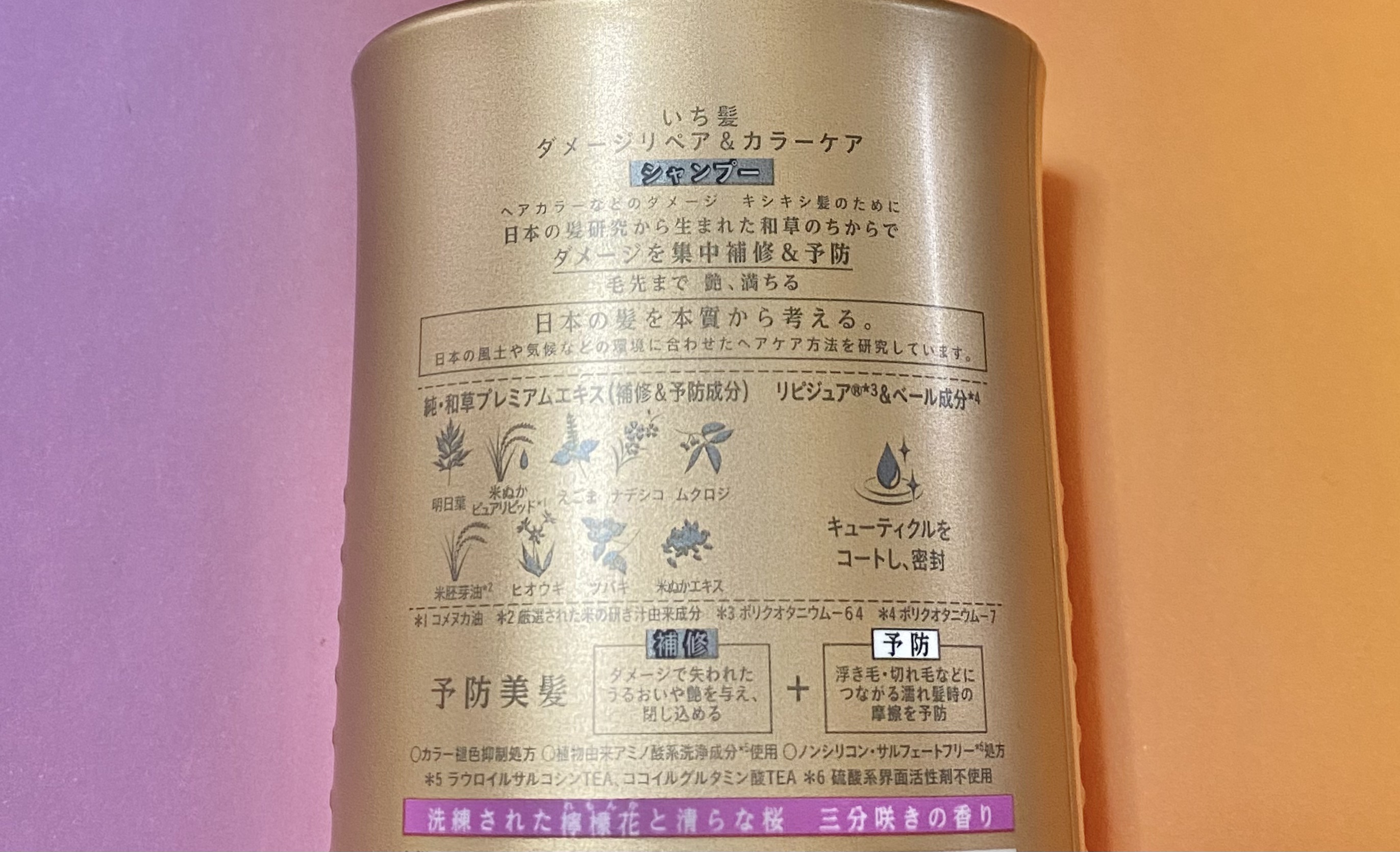 - ●「日本の髪を本質から考える。*1」ヘアケアブランド ●日本の髪研究から生まれた和草のちから、ダメージを集中補修+色あせを防ぐ予防美髪ケアシリーズ ●ヘアカラーなどのダメージによる”キシキシ髪”のために。毛先まで艶、満ちる。 ●補修&予防成分「純・和草プレミアムエキス*2」配合。 ●キューティクルをコートし、密封する「リピジュア®*3&ベール成分*4」配合 ●カラー褪色抑制処方 ●サルフェートフリー処方*6 ●洗練された檸檬花(れもんか)と清らな桜の香り(シャンプー:三分咲き、コンディショナー:七分咲き) *1:日本の風土や気候などの環境に合わせたヘアケア方法を研究しています。 *2:明日葉、米ぬかピュアリピッド(コメヌカ油)、えごま、ナデシコ★、ムクロジ★、米胚芽油(厳選された米の研ぎ汁由来成分)、ヒオウギ、ツバキ、米ぬかエキス <★シャンプーのみに配合> *3:ポリクオタニウム-64 *4:<シャンプー>ポリクオタニウム-7、<コンディショナー>セバシン酸ジエチル、ベヘントリモニウムクロリド *5:ラウロイルサルコシンTEA、ココイルグルタミン酸TEA *6:硫酸系界面活性剤不使用